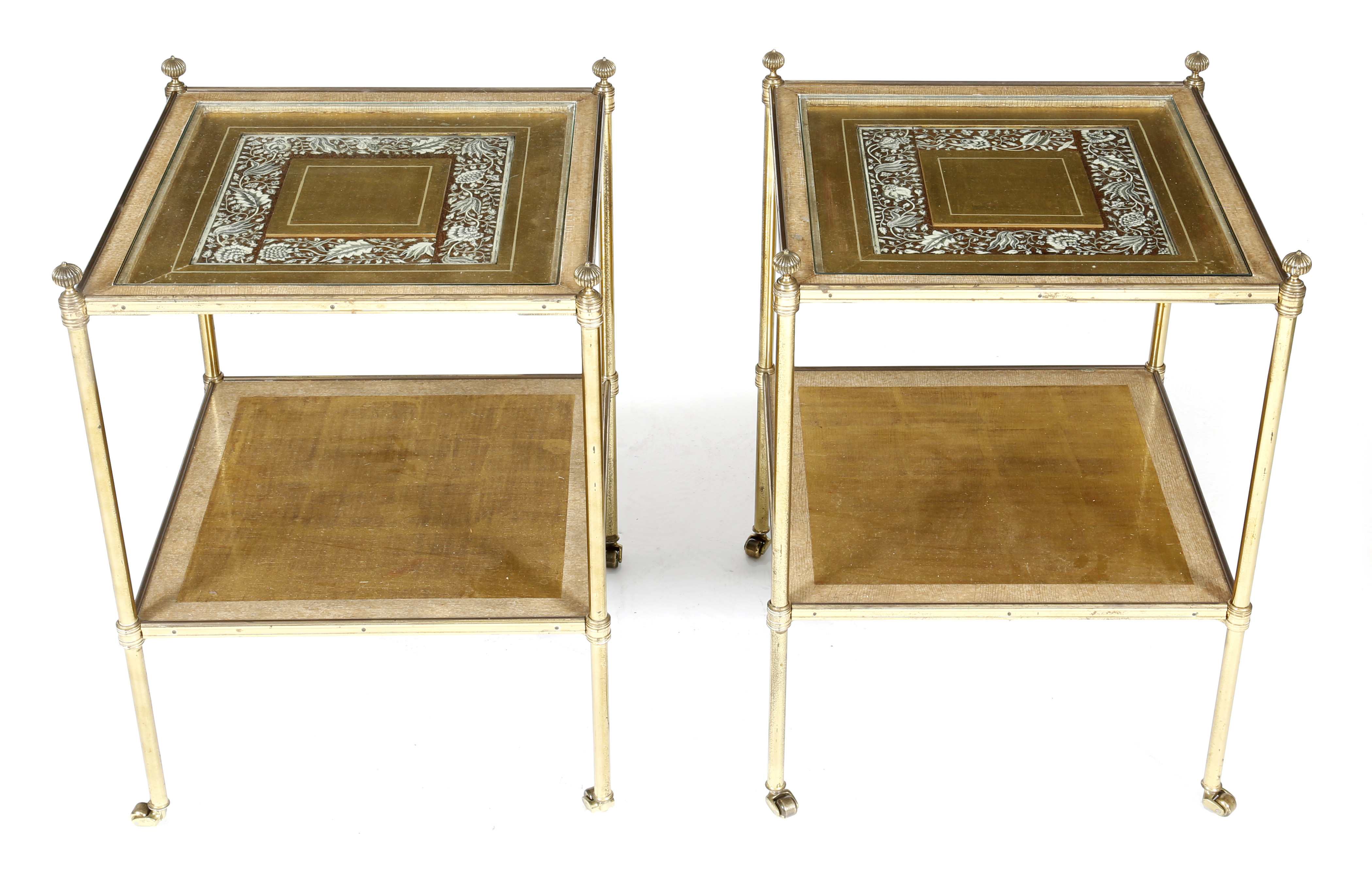λ A pair of gilt brass occasional tables, probably by Mallett, each with an inset glass top with an 18th century Indian Vizagapatam ivory floral border, on castors, mid-20th century, 59cm high, 43.2cm square. (2)