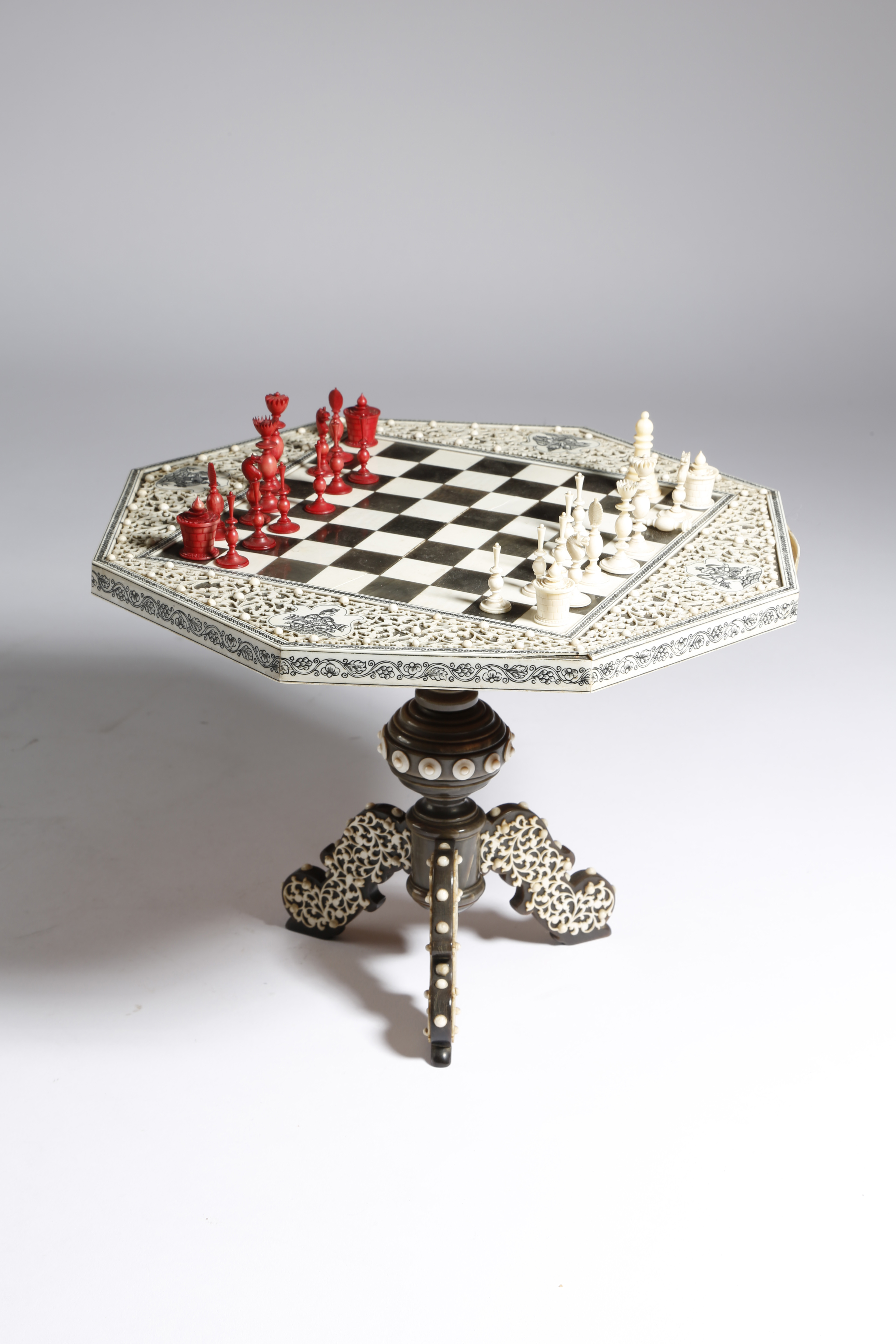 λ An Anglo-Indian ivory and horn miniature games table, the octagonal top inlaid with a chequerboard, with pierced scrolling foliage and panels of lac decorated gods, on a turned stem and scroll feet, late 19th century, Vizagapatam, 19cm high, 27.2cm wide, together with an ivory part chess set, natural and stained red. (29)