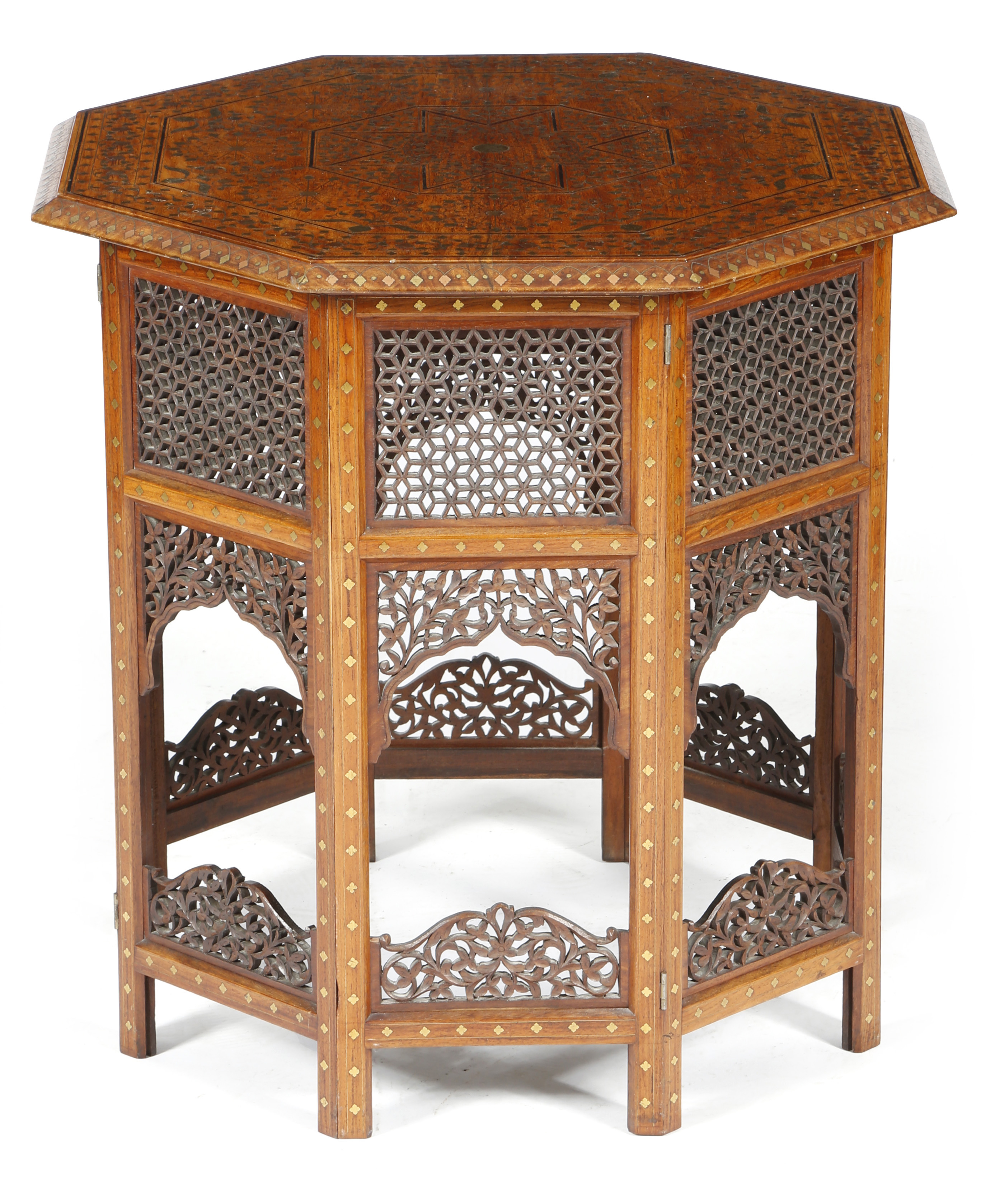 An Anglo-Indian hardwood octagonal occasional table, inlaid with copper, brass and ebony with a central star and floral borders, the detachable top on a folding base with carved and pierced panels, probably Lahore, early 20th century, 61cm high, 64.6cm wide.