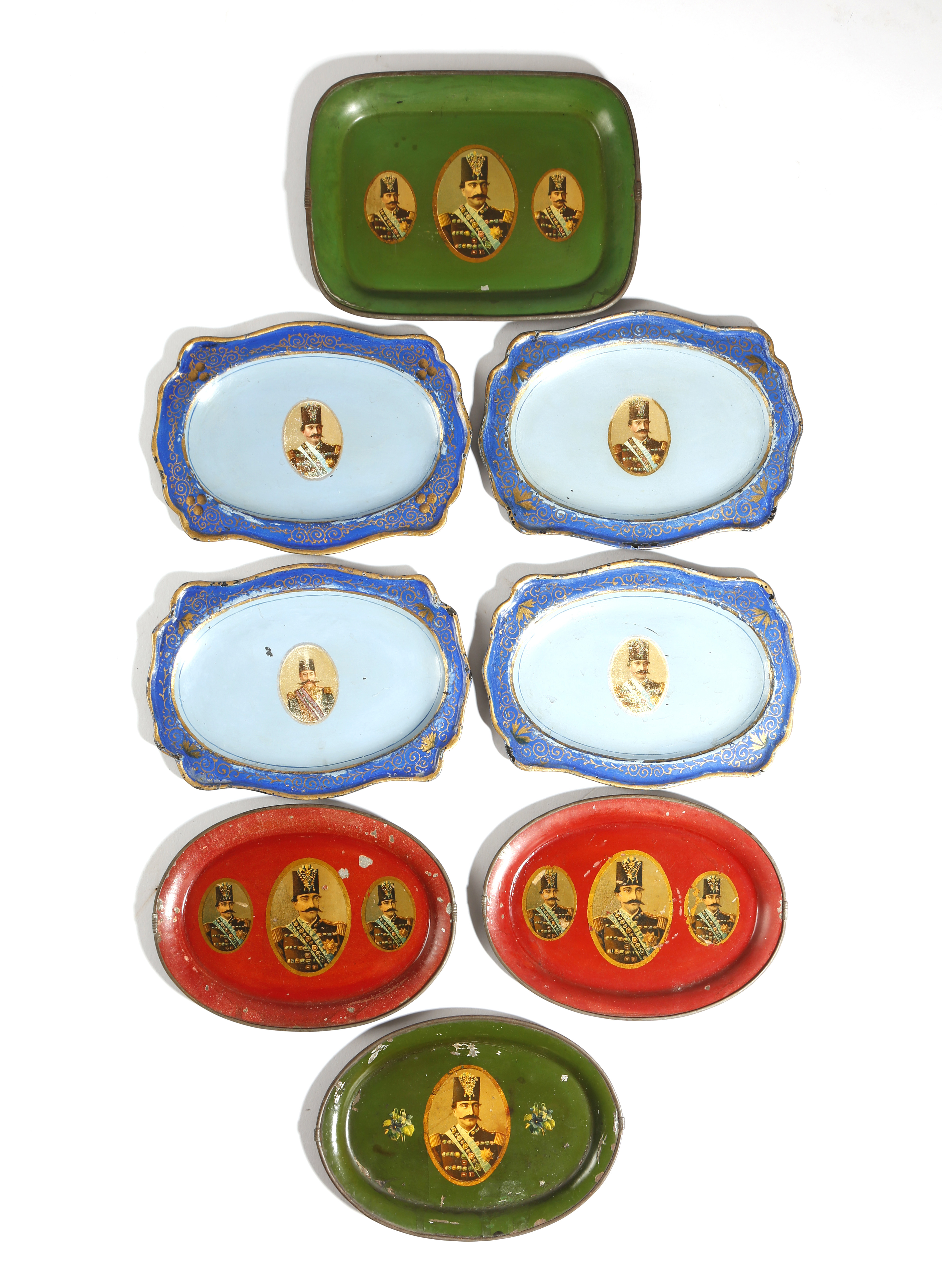 Eight continental tôle peinte dishes for the Islamic market, each printed with a portrait of Muzaffar al-Din Shah Qajar, some with retailers marks for Haji Mohammad, late 19th / early 20th century, 19.2cm wide. (8)