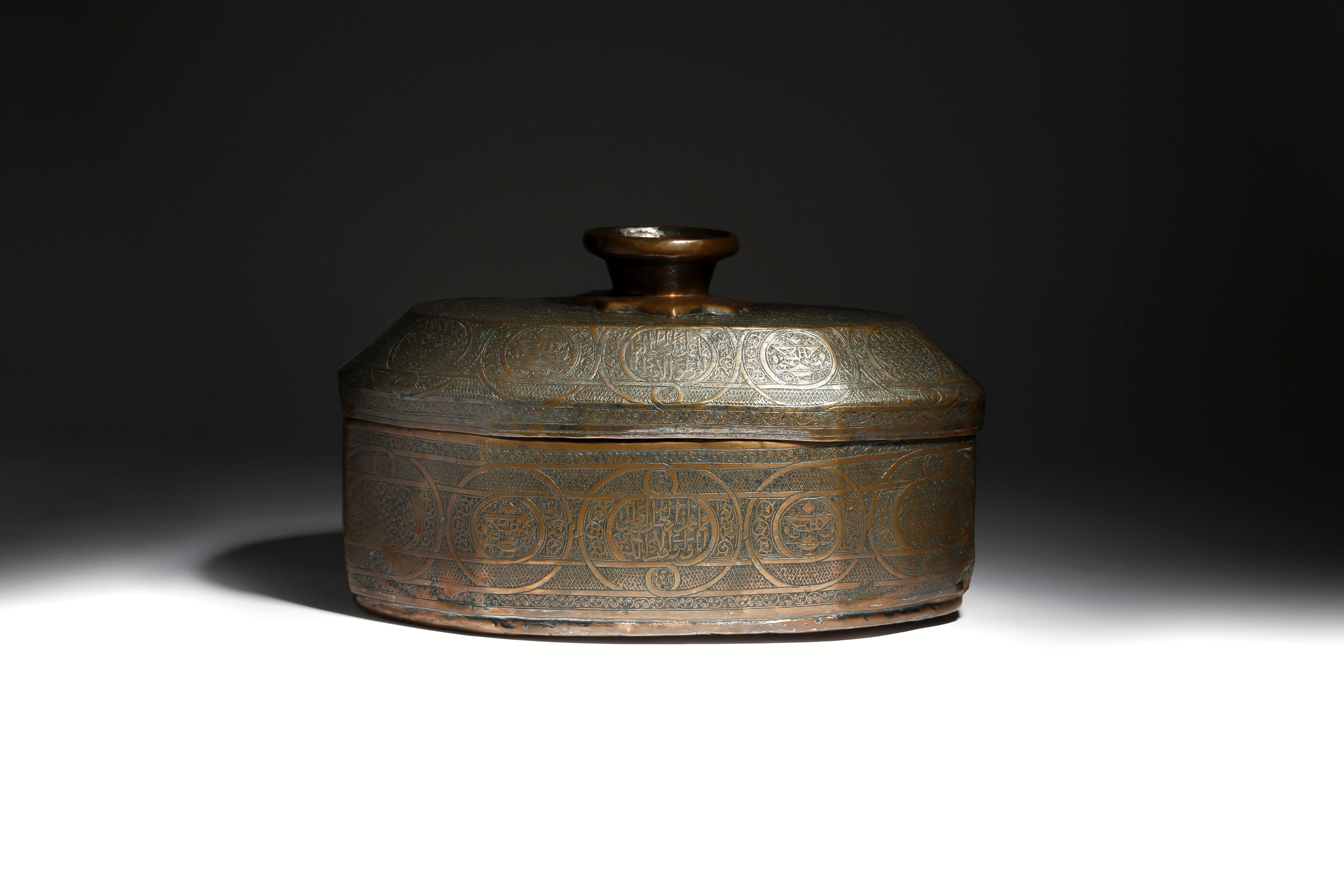 A Mamluk copper alloy canteen, of octagonal form, the lid with a dual purpose handle / foot, all over decorated with scrolling leaves, with rondels of calligraphy and hatched designs and palmettes, the underside of the lid with an Armenian inscription, Egypt or Syria, 15th century, 24.2cm high, 42.5cm wide.