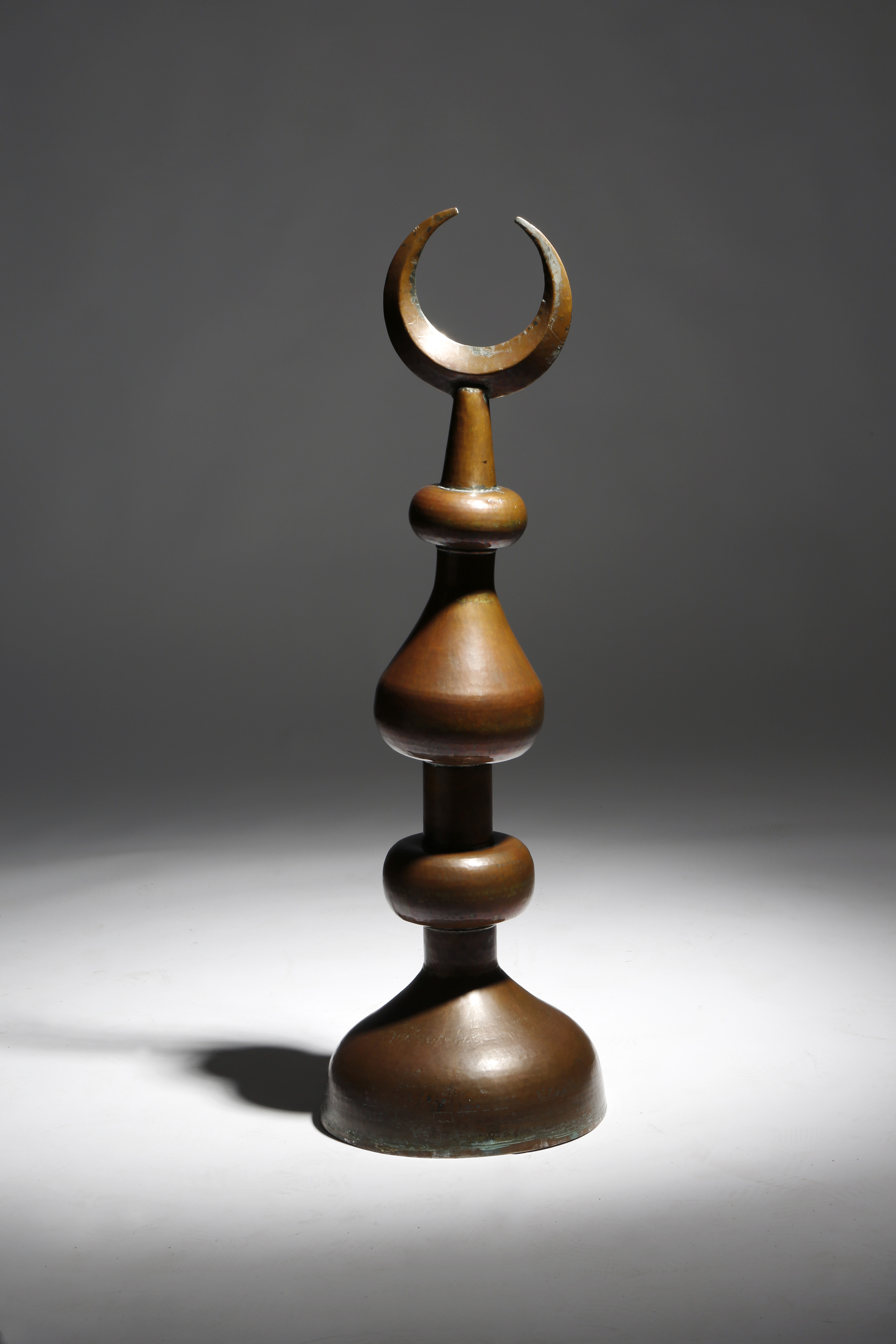 An Ottoman Islamic copper crescent form finial, the base edged with initials 'AJ' and the date '1922', possibly 18th / 19th century, 101.4cm high.