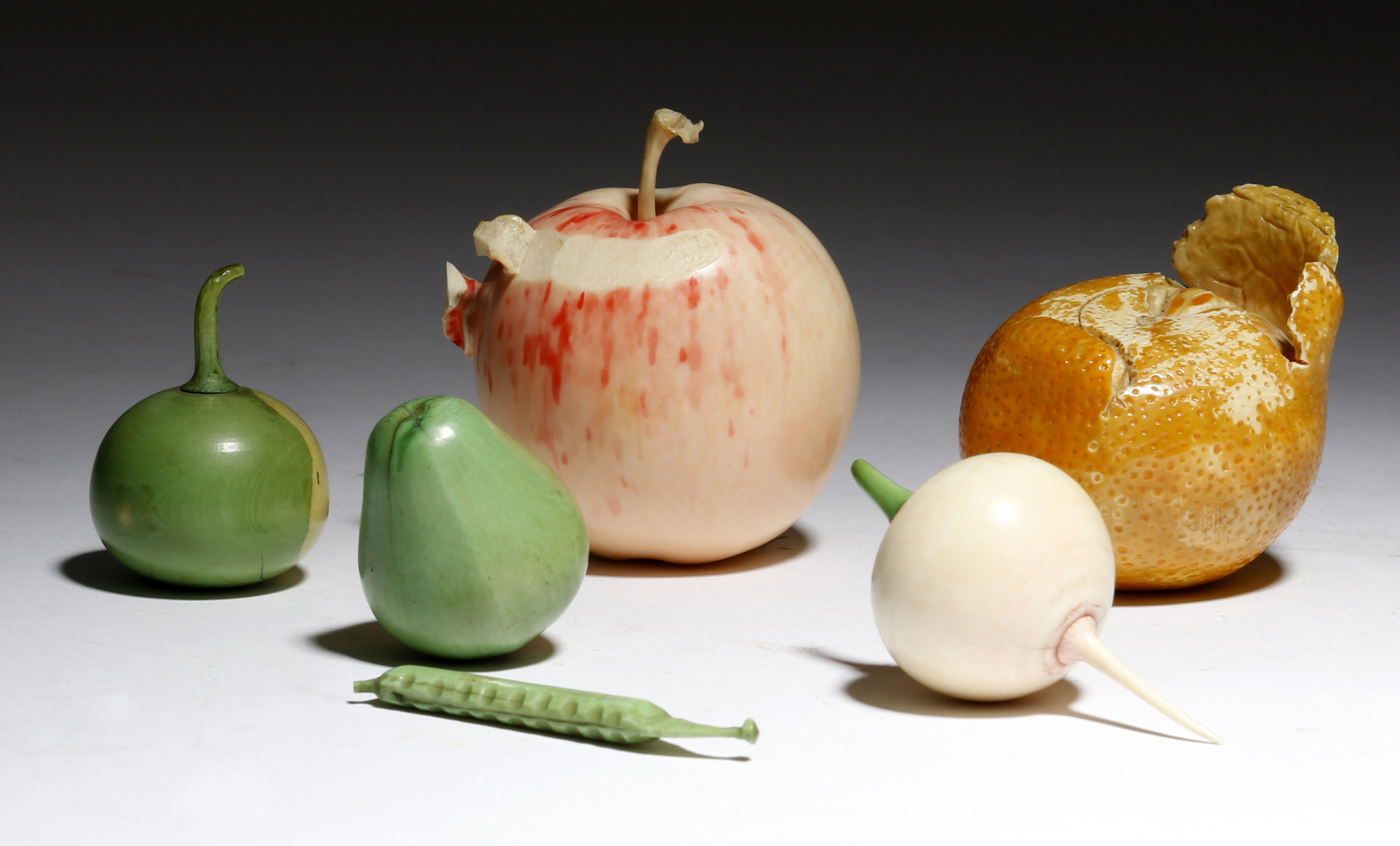 λ Two Japanese carved and painted ivory okimono of fruit, one of an apple, the skin partially peeled and stained a pink colour, the other of a tangerine orange, also partially peeled, Meiji 1862-1912, together with four Indian models of fruit / vegetables, two as scent boxes with screw-off stalks, late 19th century, 6.7cm high (max). (6)