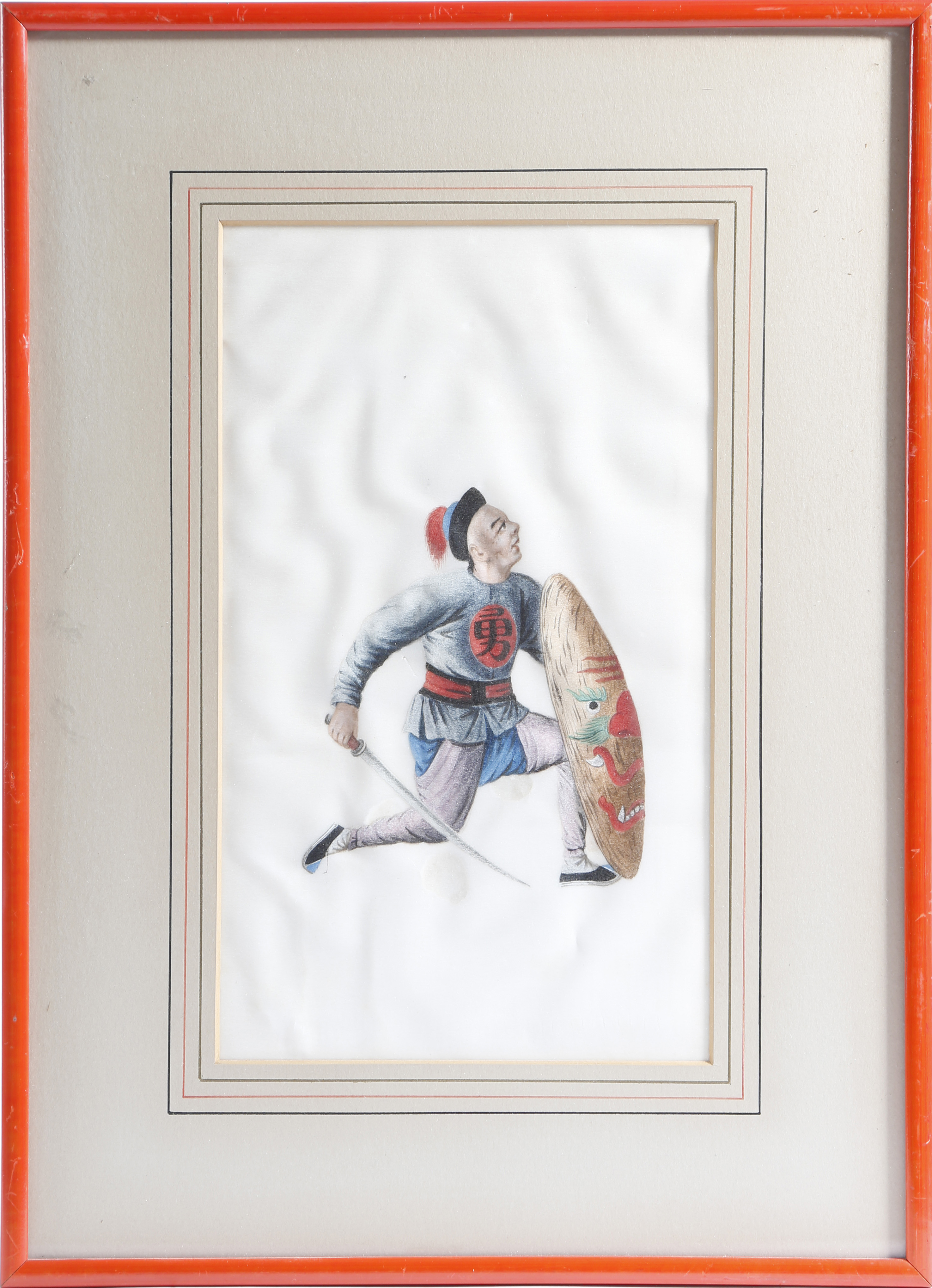 Five Chinese gouache rice paper paintings, one of a Chinese official, the other four of soldiers, carrying shields and swords, late 19th century, 27 x 16.2cm, later mounted, framed and glazed, the backs with trade labels for 'FROST & REED'. (5)