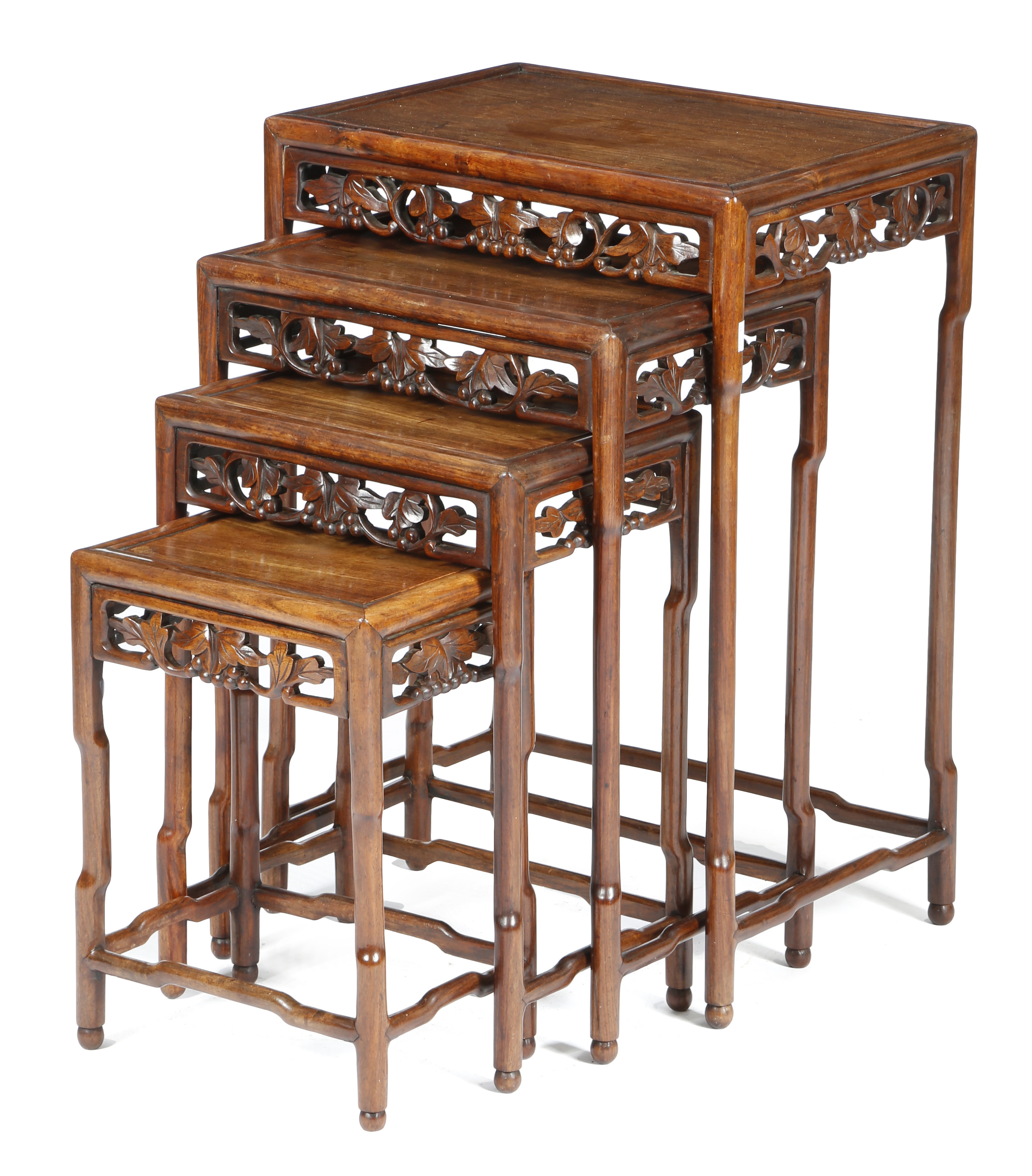 A quartetto nest of Chinese padouk occasional tables, each with a pierced frieze carved with a grapevine, on stretchered legs, late 19th / early 20th century, 69.8cm high,48.7cm wide, 34.7cm deep (max). (4)