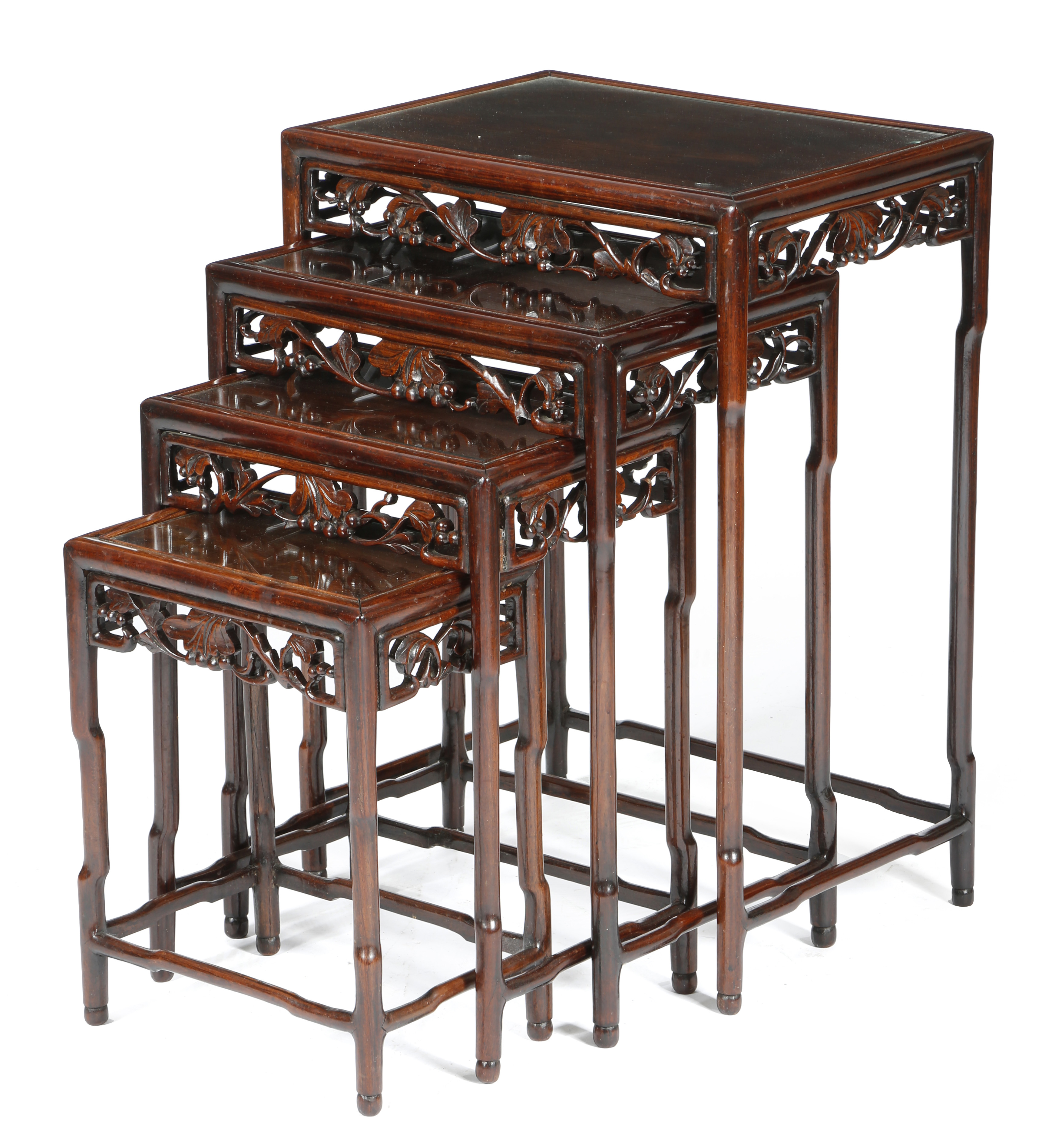 A quartetto nest of Chinese padouk occasional tables, each with an inset glass top, above a carved and pierced frieze of a grapevine, late 19th /early 20th century, 71.6cm high, 51cm wide, 37cm deep (max). (4)
