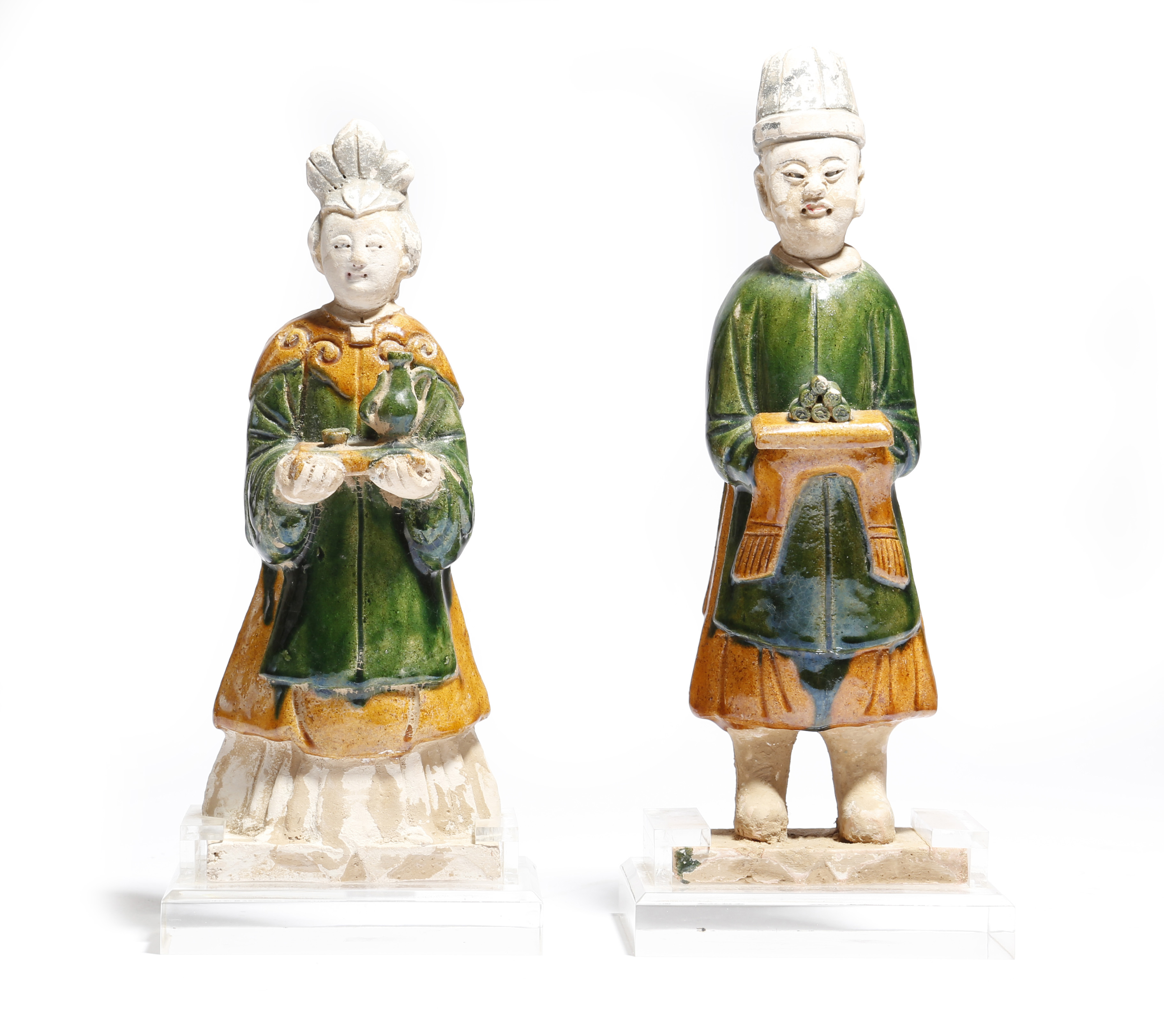 Two Chinese glazed pottery figures of attendants, wearing tunics, boots and hats and holding offerings, Tang Dynasty, 27.3cm high, each on a later Perspex base. (2)