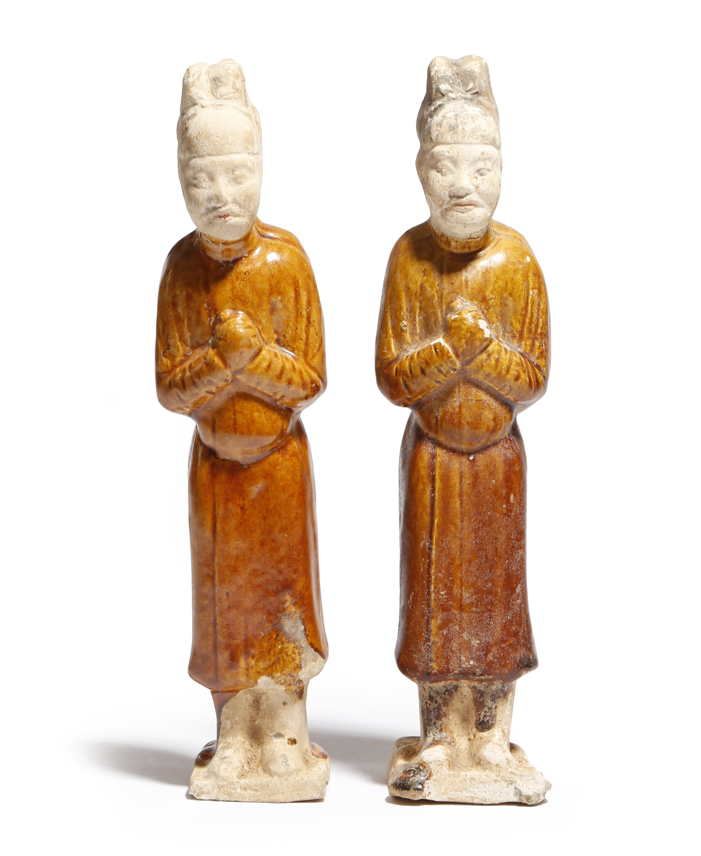 Two Chinese ochre glazed pottery figures, each wearing robes and sporting a headdress, Tang Dynasty, 24.3cm high. (2)