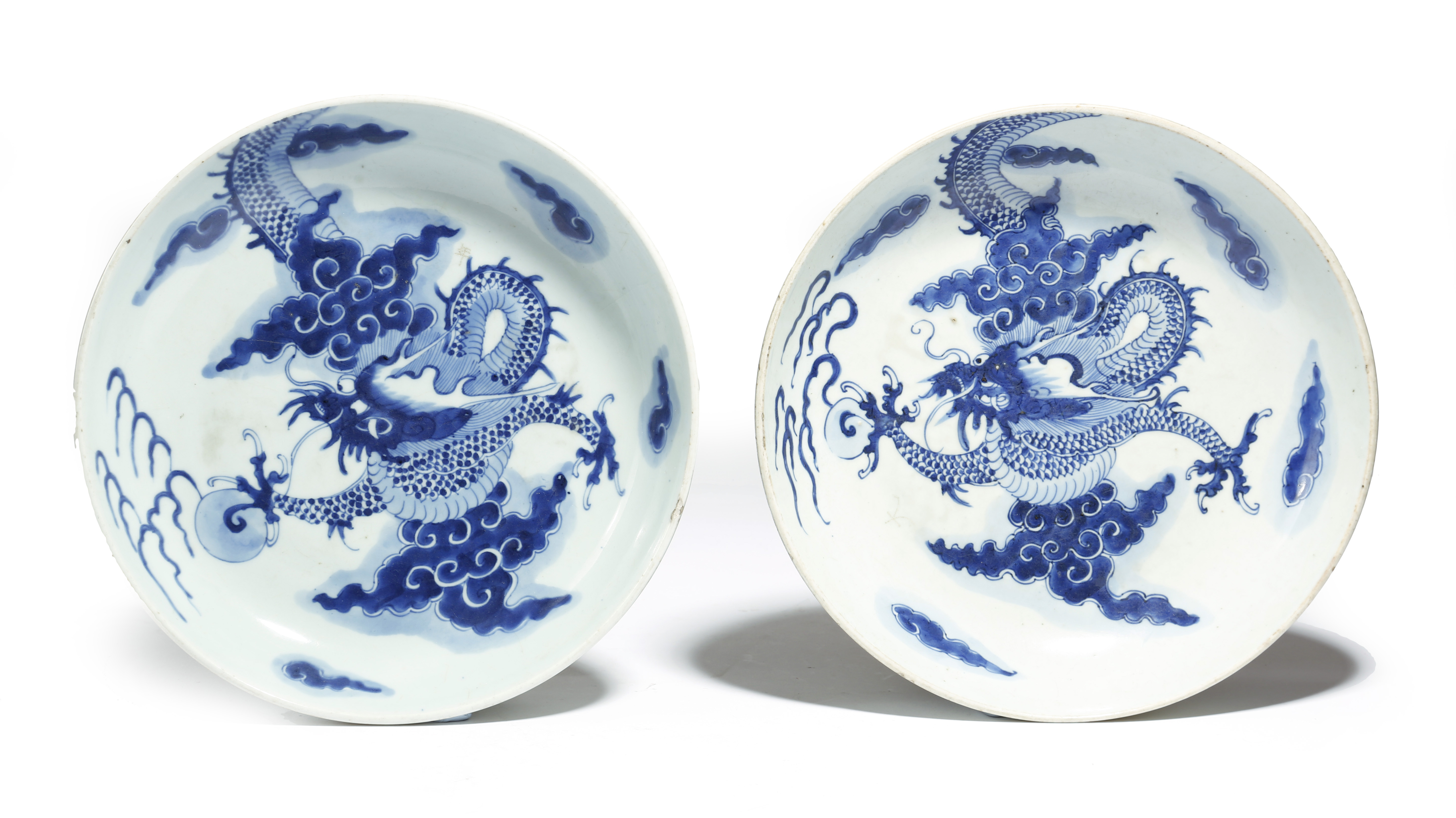 A matched pair of Chinese porcelain blue and white saucer dishes, each decorated with scaly dragons chasing a pearl, Qing Dynasty, 28cm diameter. (2)
