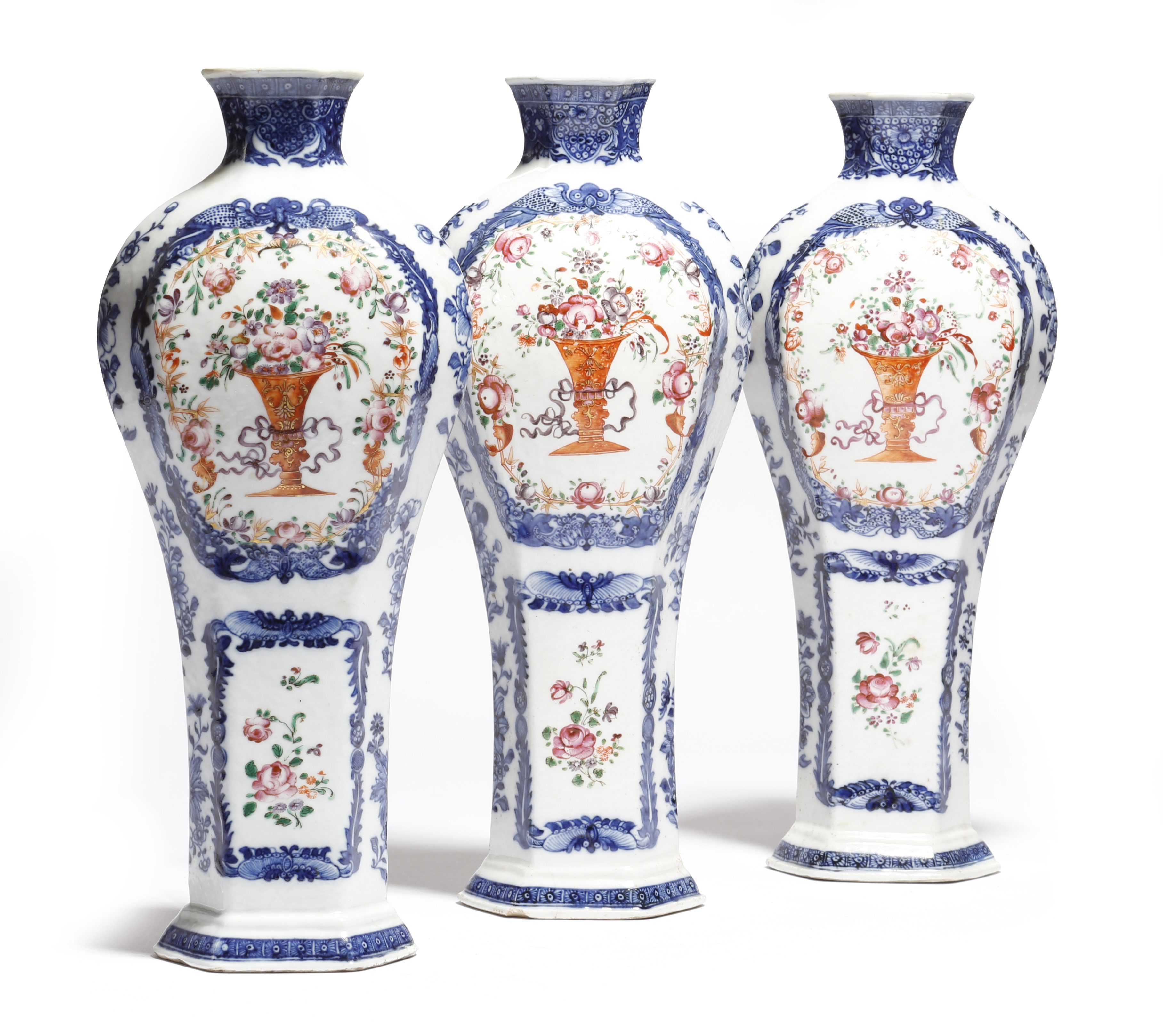 A set of three Chinese porcelain famille rose flattened baluster vases, with underglaze blue decoration and painted with vases of flowers, Qianlong, 29.1cm high. (3)