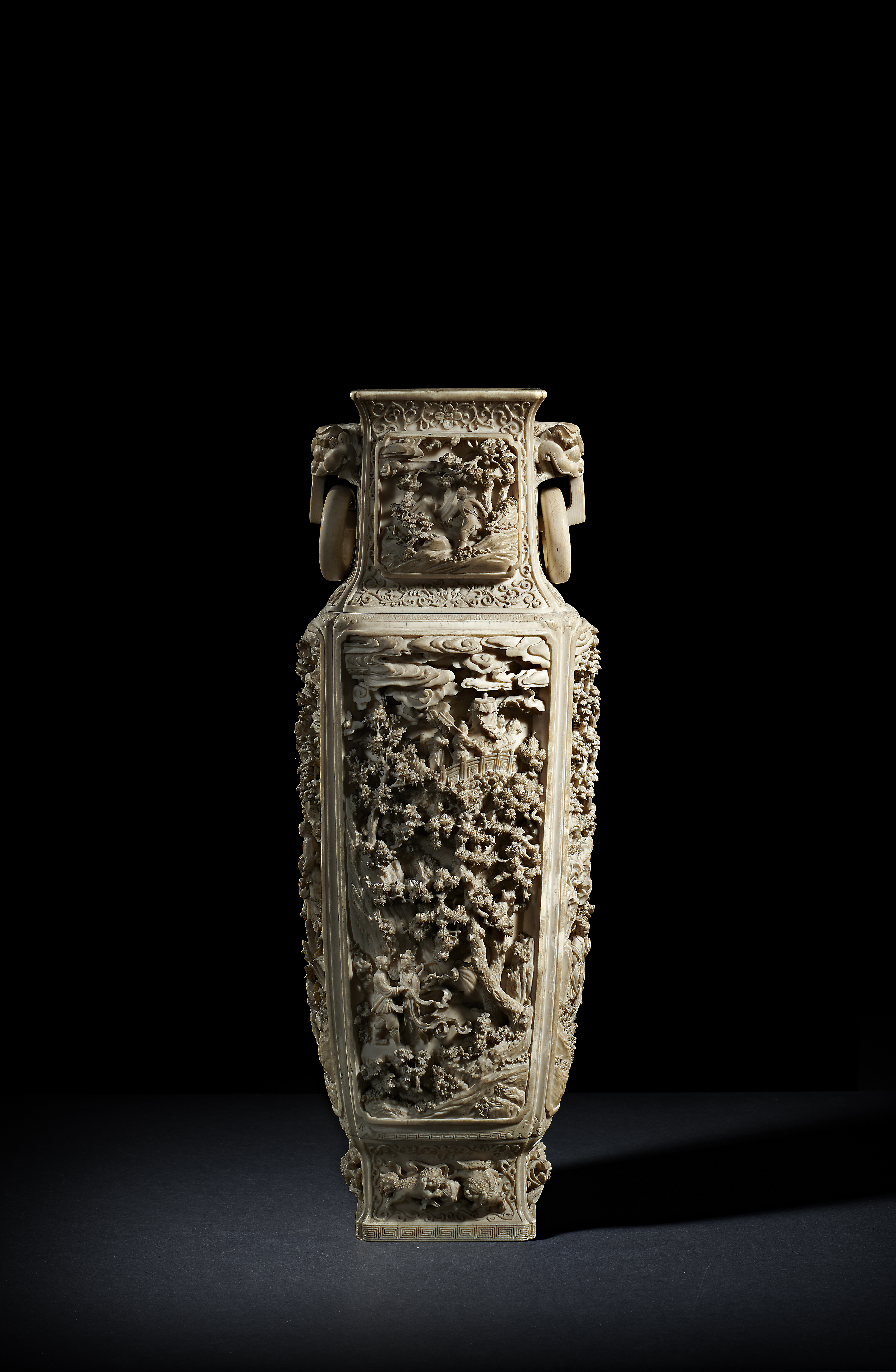 λ A massive 19th century Chinese ivory vase, the rectangular body finely and elaborately carved, with four panels depicting the story of the cowherd Niulang and the weaver girl Zhinu, within cloudy rocky landscapes with pine trees, buildings and other figures, the neck with two further panels and with lion dog mask ring handles, on a scrolling foliage ground, the base with further playful dogs above a Greek key band, 44.5cm high, together with a hardwood stand.