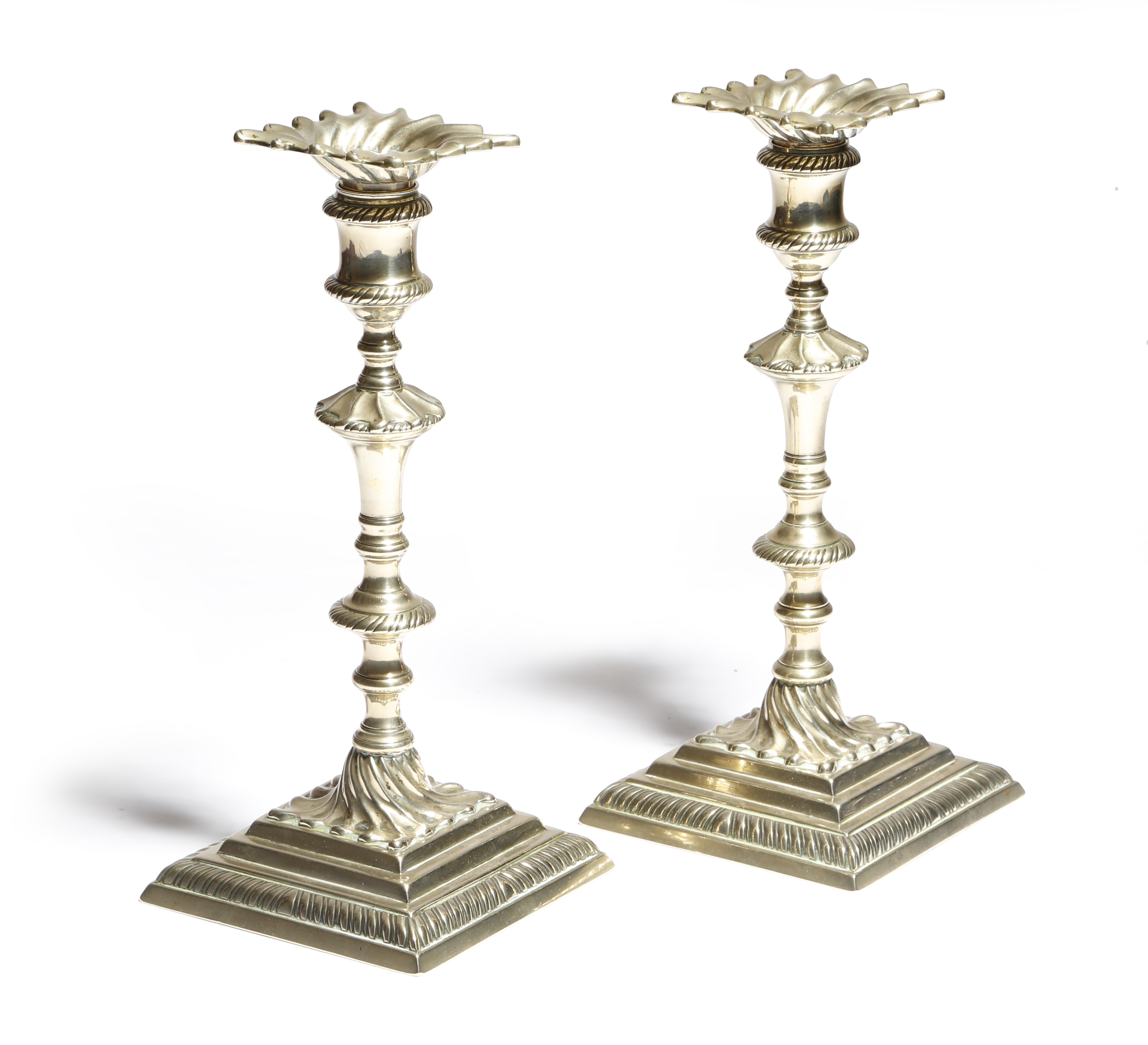 A pair of late 18th century paktong candlesticks, each with a fluted detachable drip-pan above a knopped stem, on a stepped square plinth foot, 26cm high. (2)