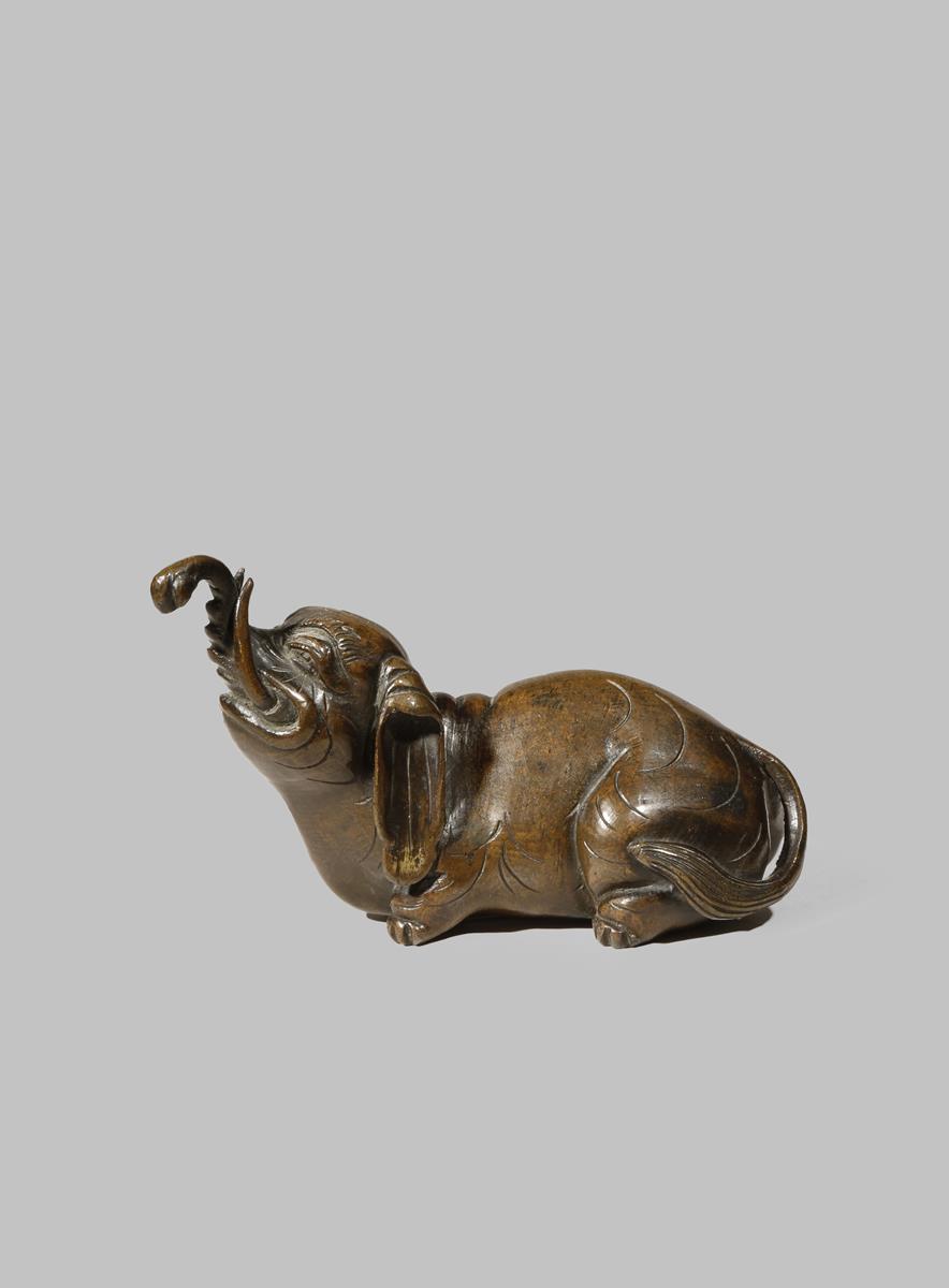 A JAPANESE BRONZE 'ELEPHANT' SCROLL WEIGHT EDO 1615-1868 The recumbent pachyderm with his head...