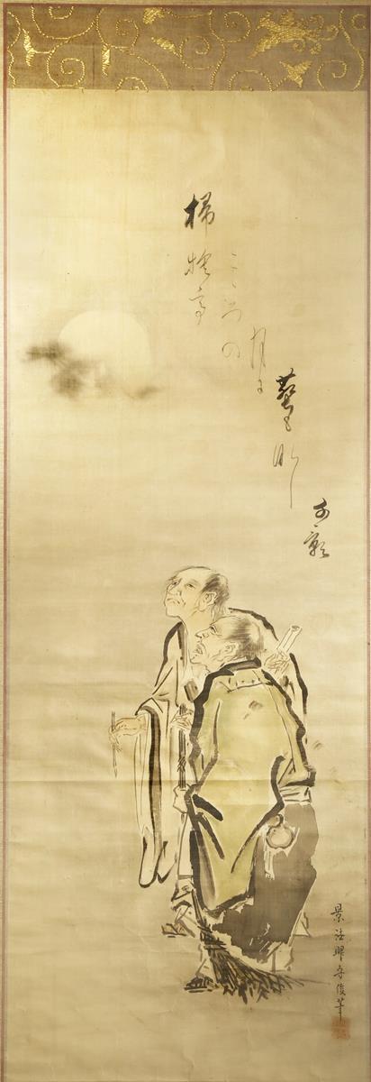 TWO JAPANESE SCROLL PAINTINGS ON SILK MEIJI 1868-1912 One depicting Kanzan and Jittoku gazing at...