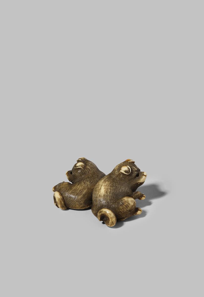 A JAPANESE IVORY NETSUKE MEIJI 1868-1912 Carved as two chubby-looking puppies lying back to back