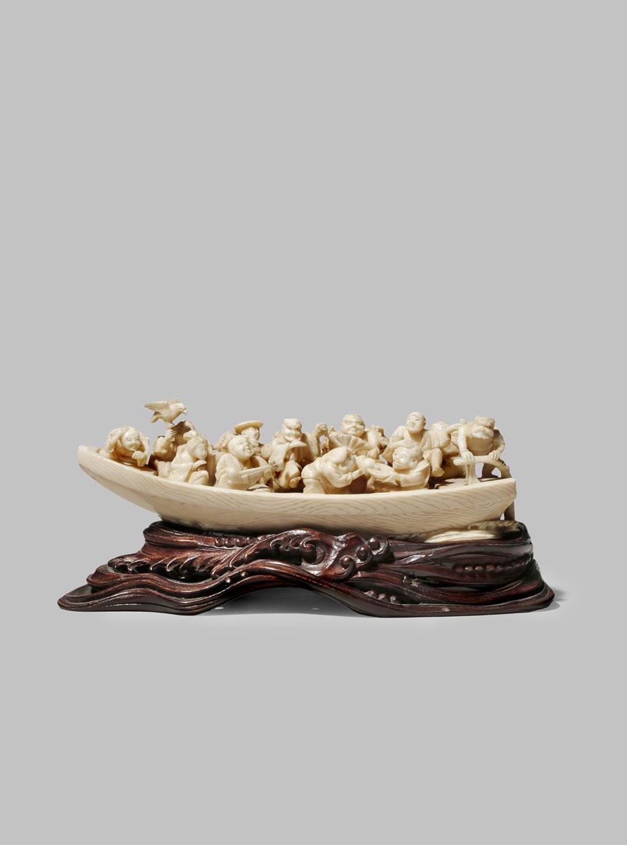 A JAPANESE IVORY OKIMONO MEIJI 1868-1912 Carved as a Treasure Boat