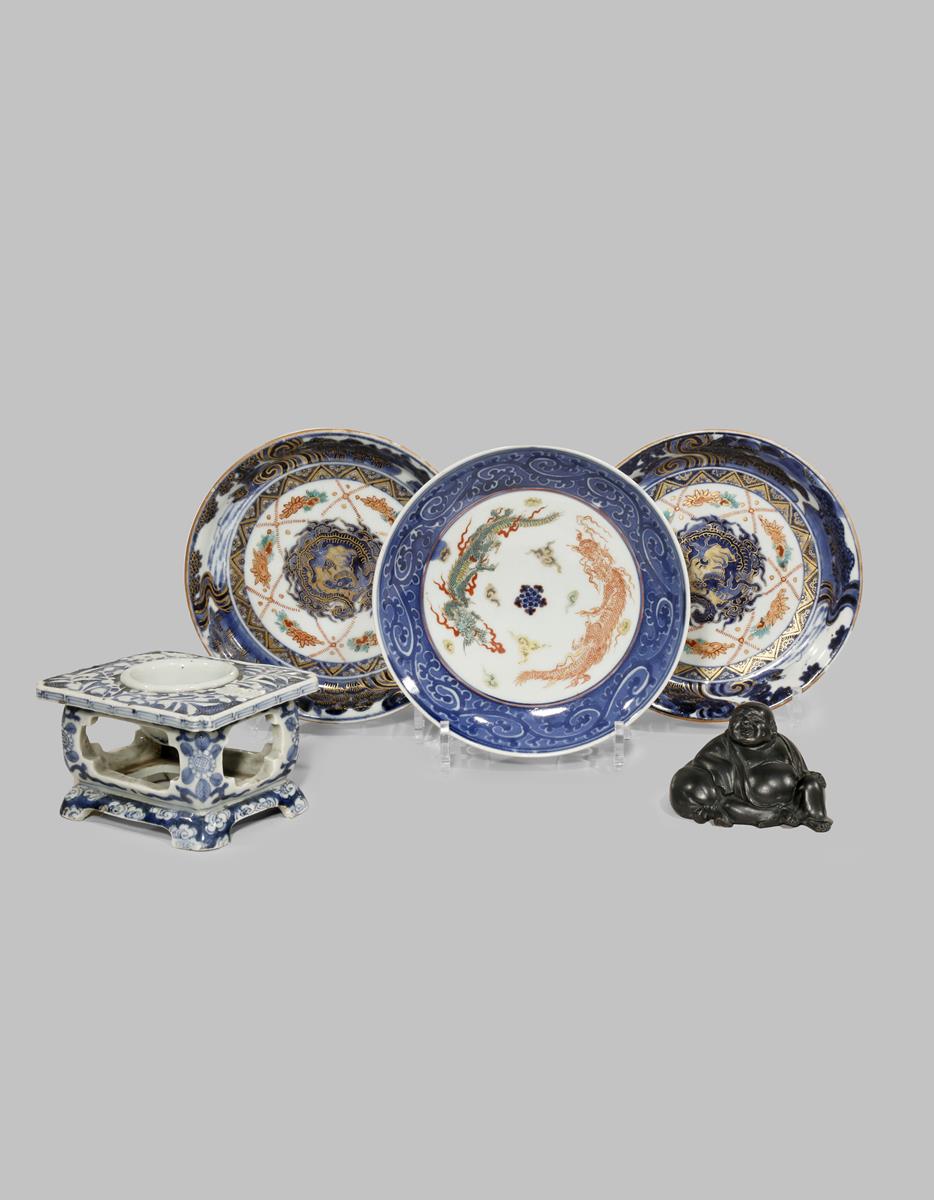 Decorated with dragons, six character Chenghua marks, a blue and white Hirado moulded inkwell, and a bronze model of Hotei, signed Joko/Tsunemitsu, 18cm max. (5)