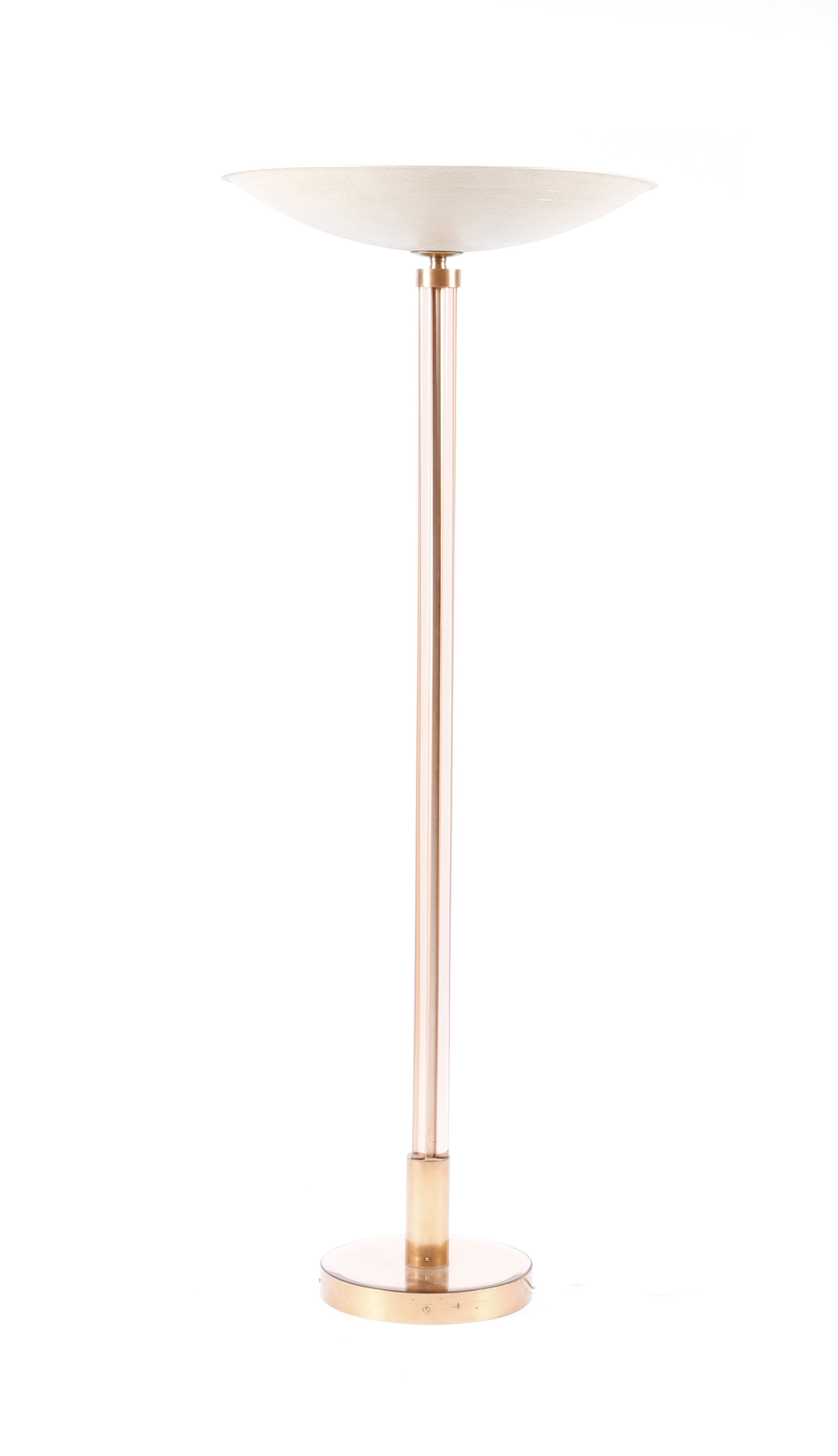 An English Art Deco peach-tinted mirrored glass standard uplighter lamp, three peach glass tubes supporting textured paper shade, unsigned, 157cm. high
