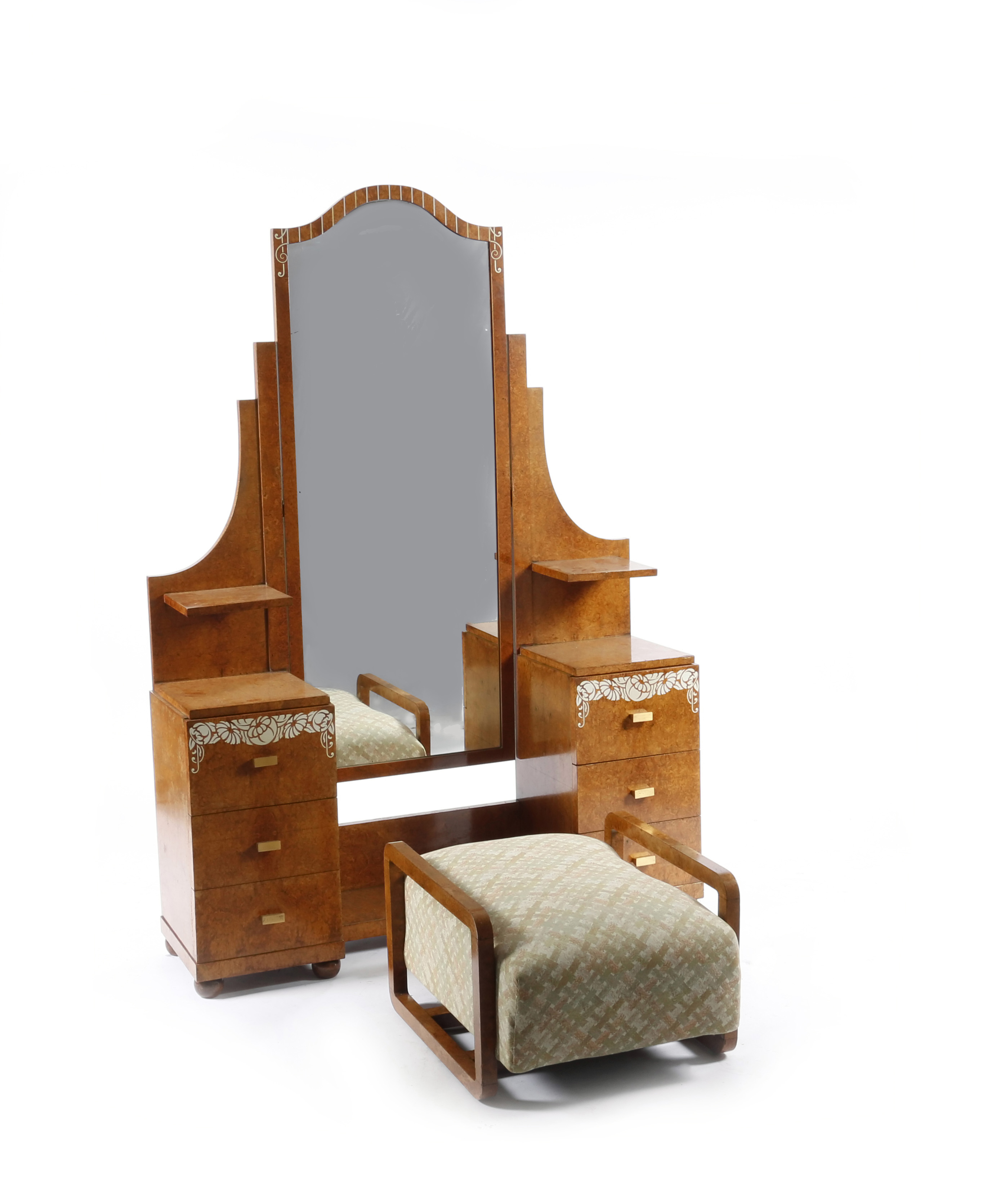 λ An Art Deco Mercier Freres Paris burr maple veneer bedroom suite, comprising large double wardrobe, bed, dressing table and stool, inlaid with silver and ivory flower garlands, applied label to drawer, 185cm. high, 150 wide (wardrobe), (4)