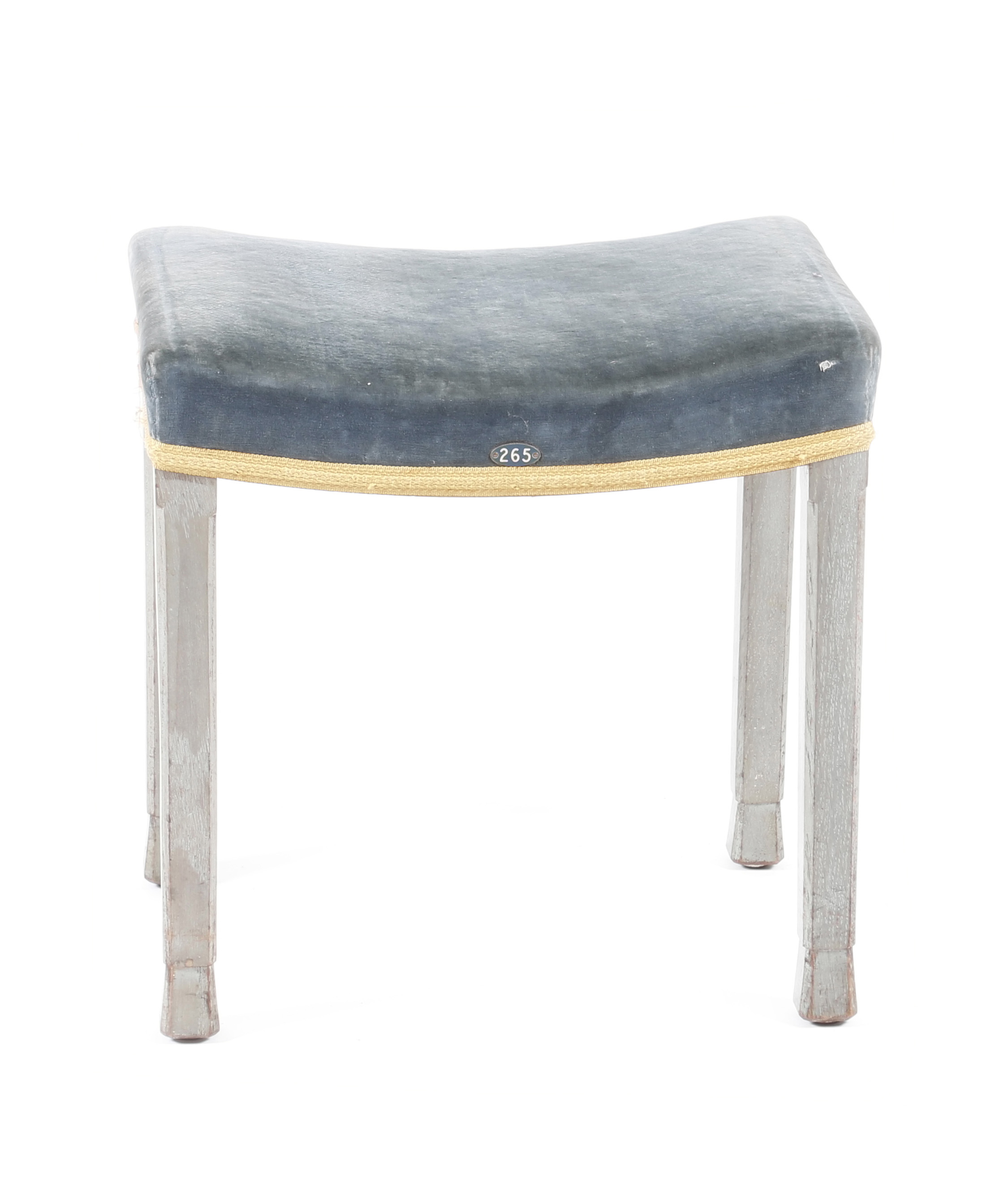 A W Hand & Sons Elizabeth II Coronation stool from 1953, blue velvet pad with gold braid edging, limed oak frame, with applied number 265, stamped ER Coronation to sub-structure, 84cm. high
