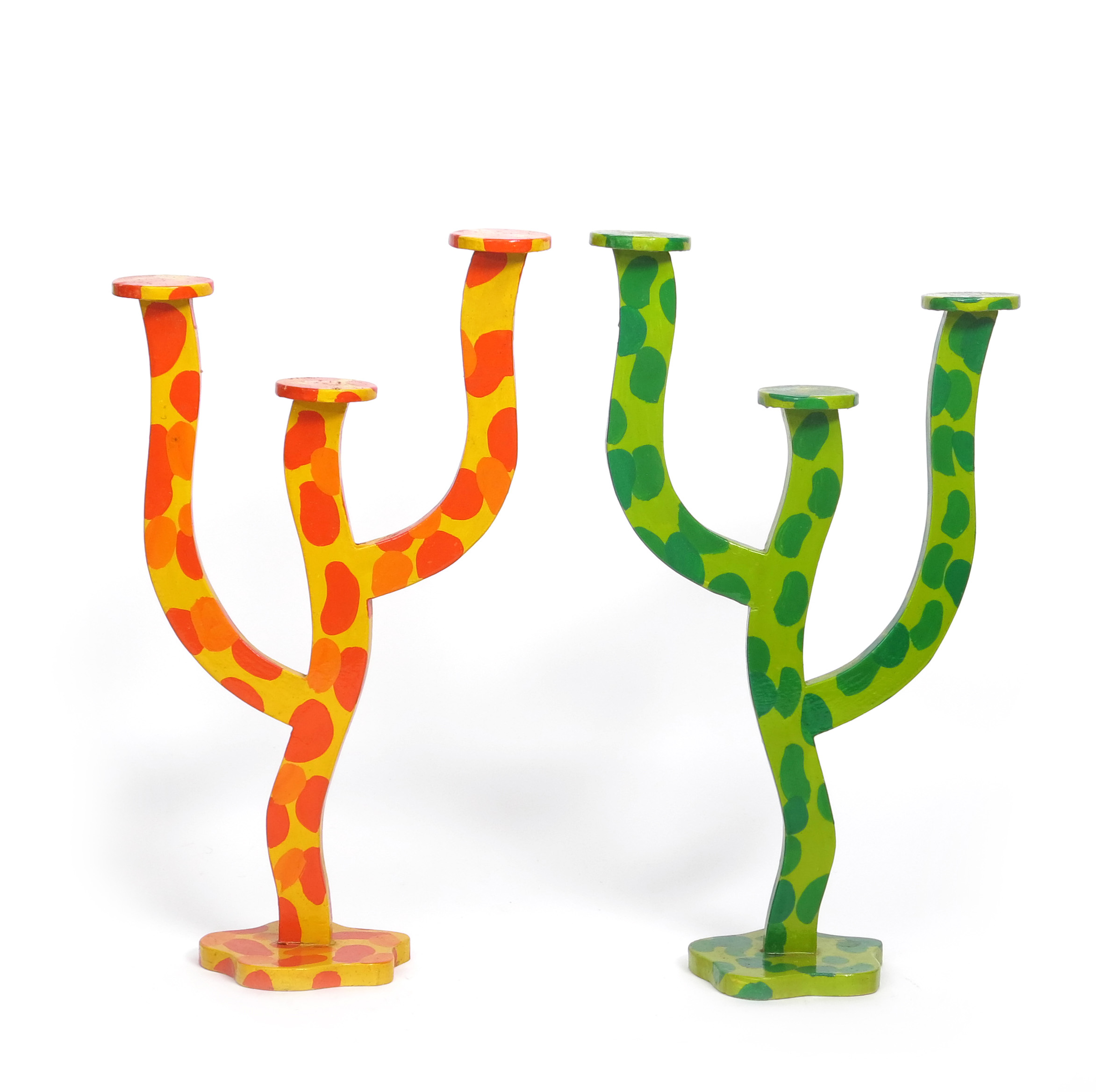 A pair of Soho Crafts painted wood candelabra, one painted in vivid lime green, the other vivid orange, unsigned, 57cm. high, (2)