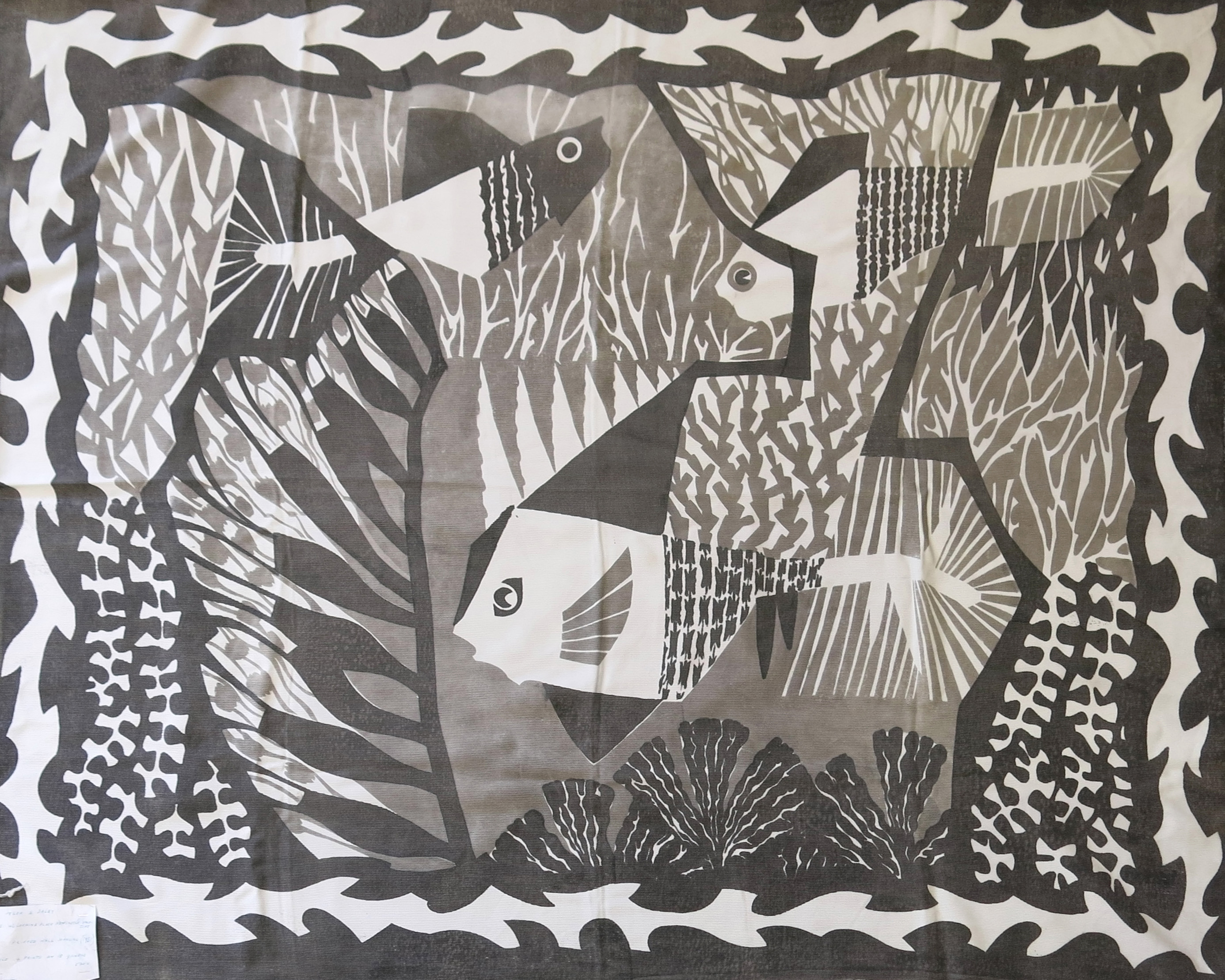 Fish a printed wall hanging by Helen Dalby, dated 1951, printed in grey and black on a white ground, paper label pinned to corner, 132 x 110cm