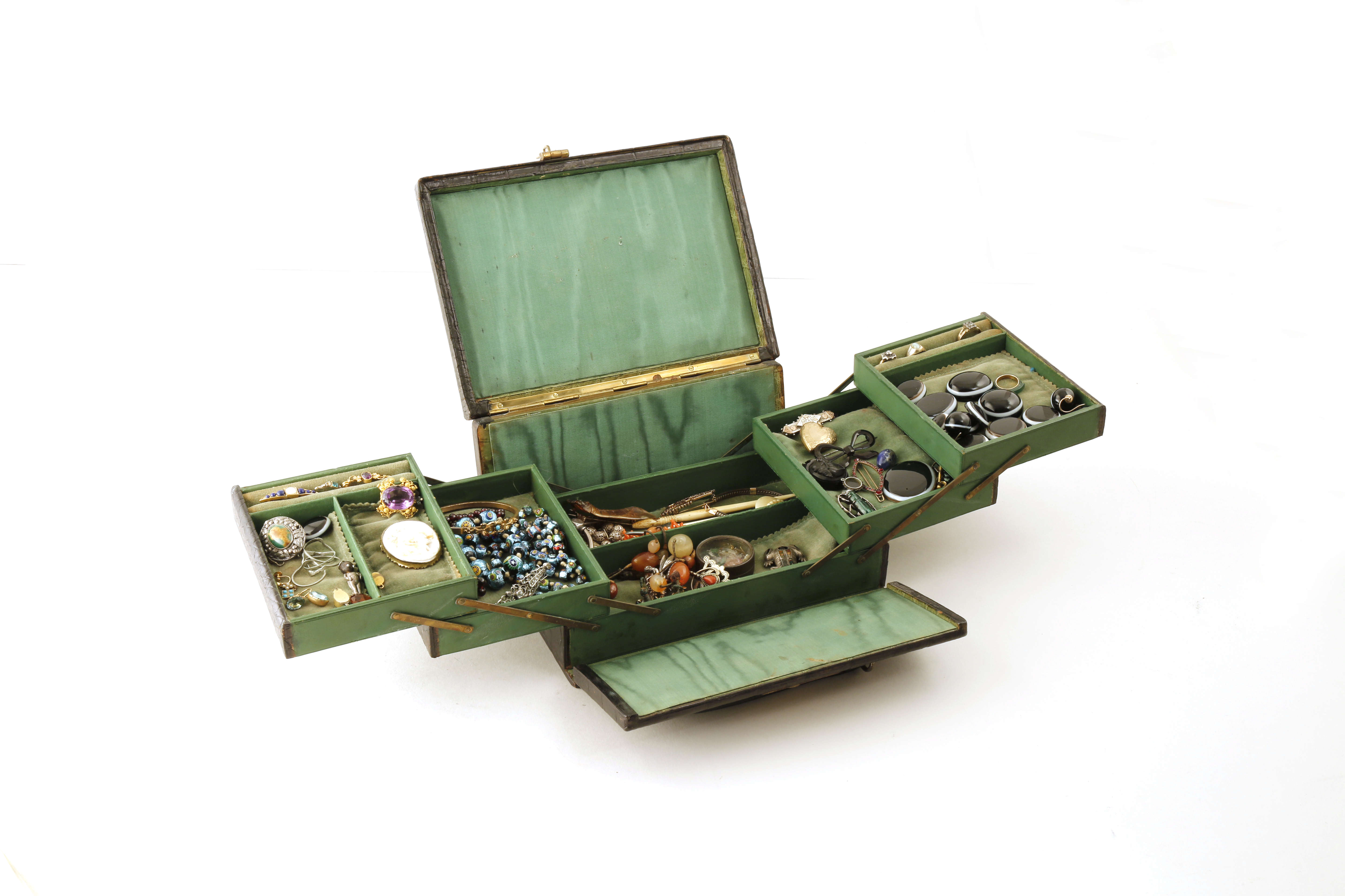A crocodile leather jewellery box, with four hinged swing trays and containing assorted jewellery