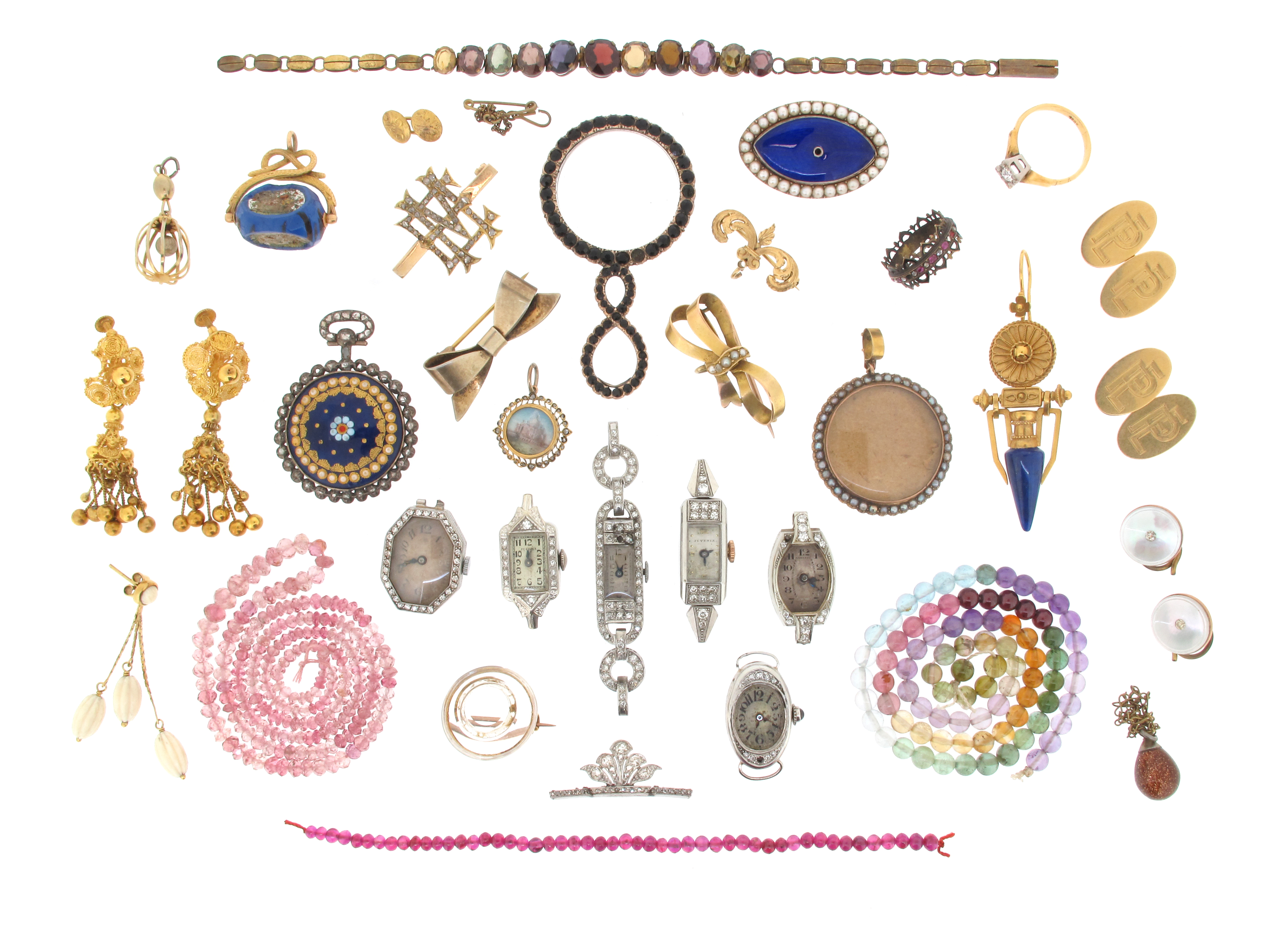 Various items of jewellery, etc., including seven brooches, a glazed gold locket pendant with seed pearl border, a quizzing glass, a pendant with enamel decoration and rose diamond border, six cocktail watches with diamond bezels, a miniature painting of the Taj Mahal in gold mount with rose-cut diamond border, a pair of 18ct gold cufflinks, an Etruscan Revival gold drop earring with lapis lazuli amphora pendant, a stone-set bracelet