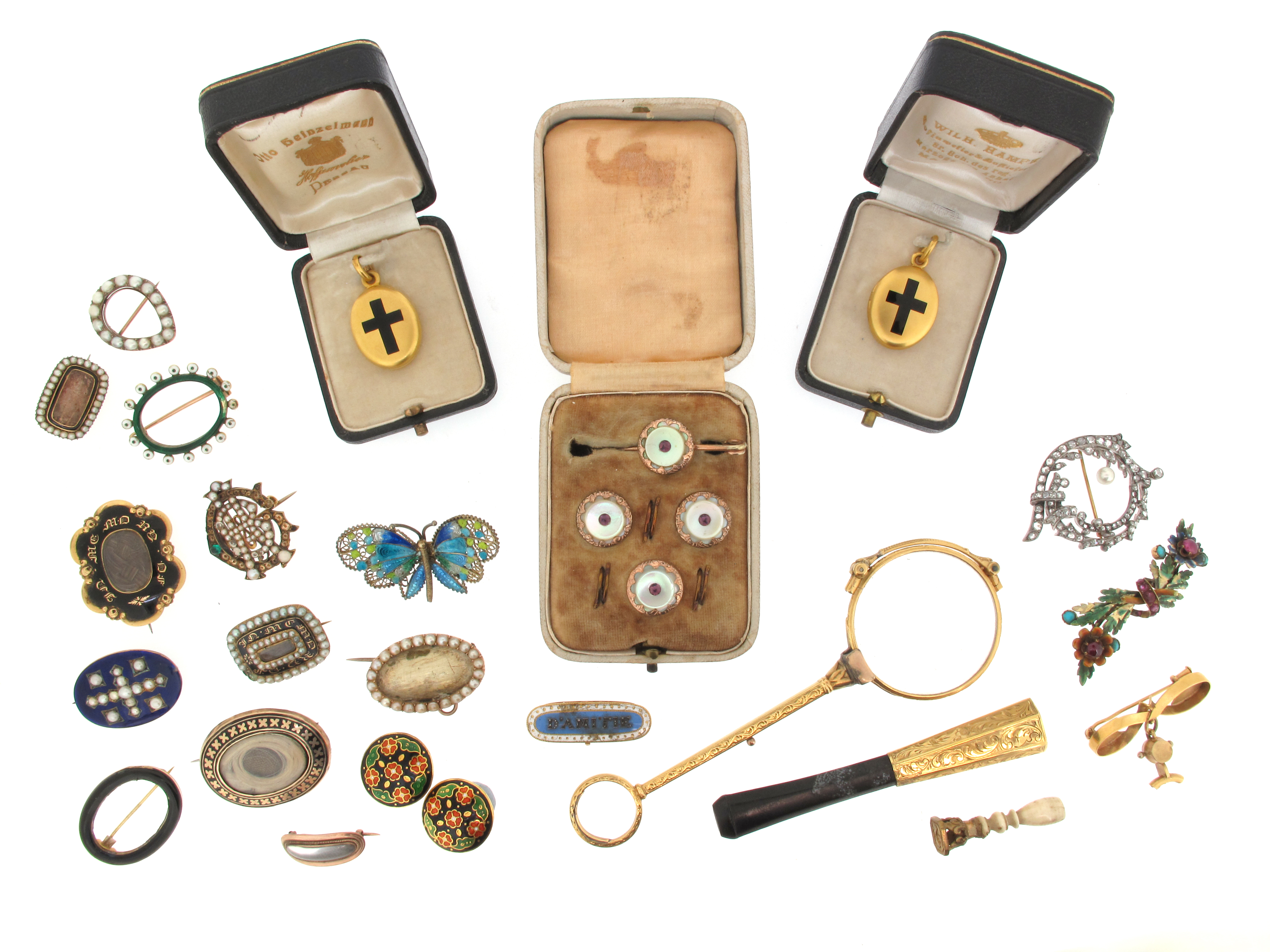 A late 19th century diamond wreath brooch, set with rose-cut diamonds in silver and gold, Russian marks, 3cm wide, two matching gold mourning lockets, inscribed for 1908 and 1904, both cased, with a selection of gold and enamel mourning brooches, a cheroot holder, a lorgnette and a cased set of buttons with a bar brooch