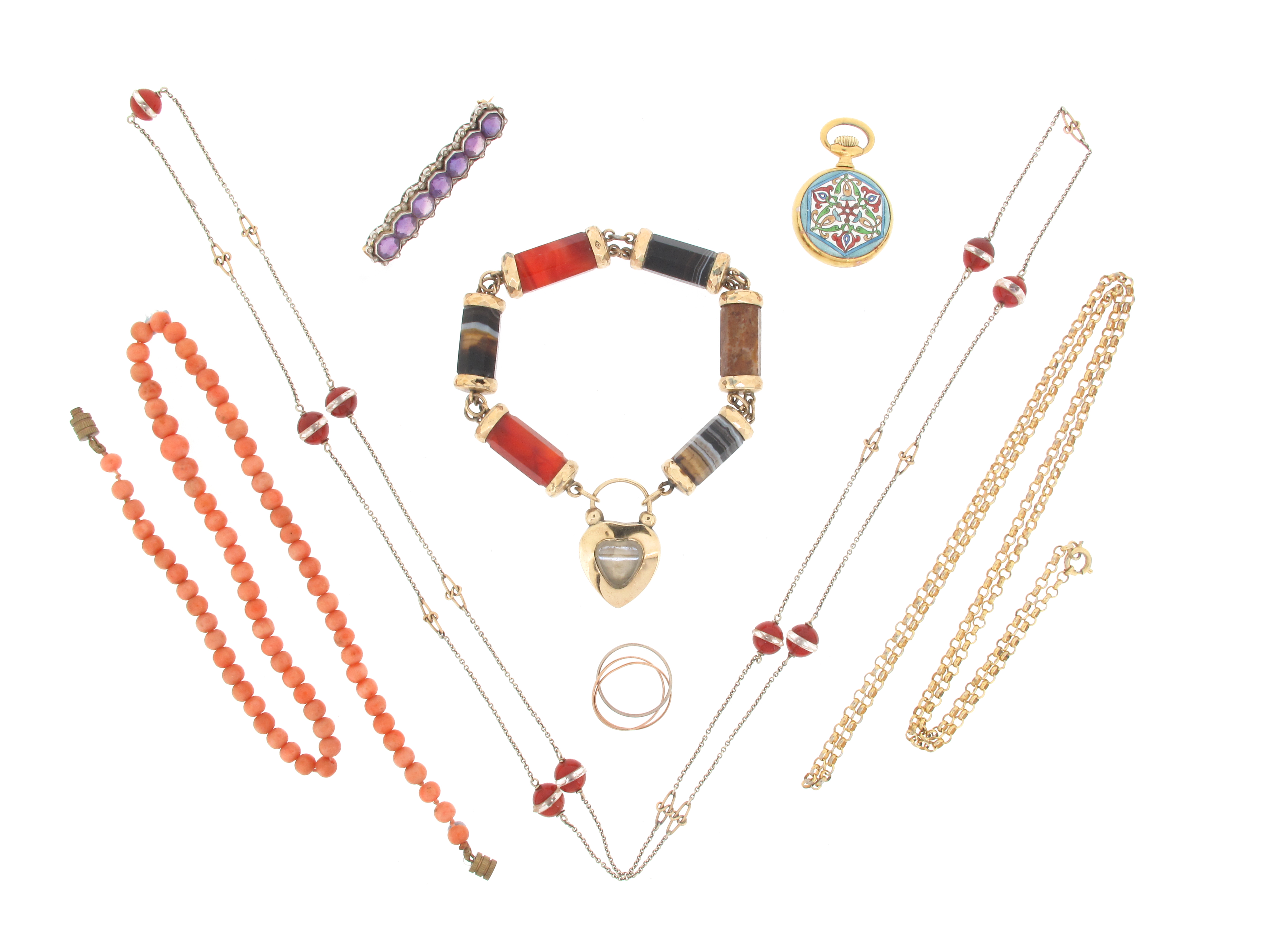 An amethyst and diamond-set platinum and gold bar brooch, set with seven octagonal-shaped amethysts within an undulating border of rose-cut diamonds, 4.5cm wide, a gold Scottish pebble bracelet with heart-shaped locket clasp, a small gold 'Russian' three-colour ring, size K, a coral-bead necklace, a carnelian and crystal rondel bead necklace, a small open-faced fob watch and a neck chain