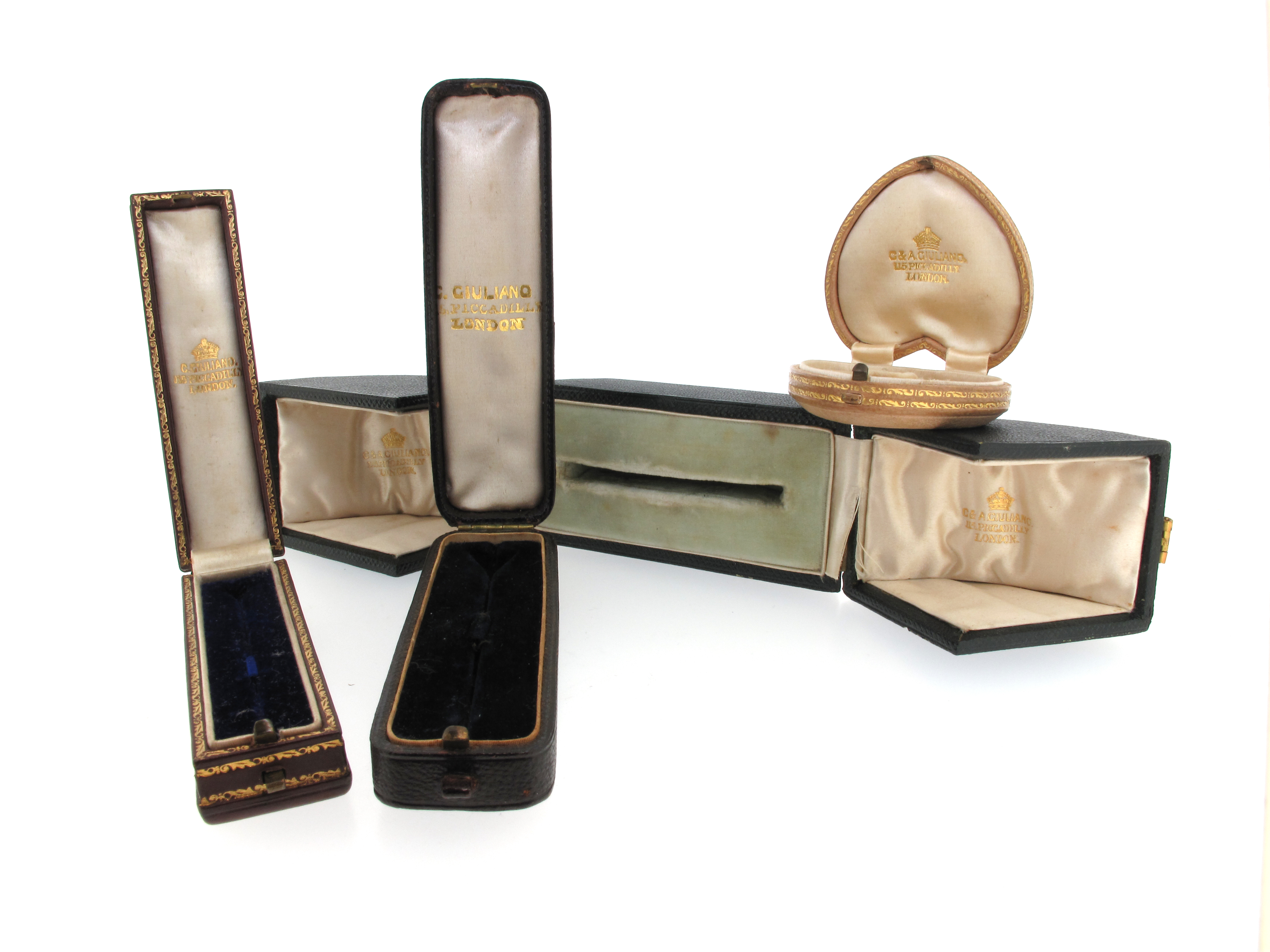 Four jewellery boxes for Giuliano, two for stick pins, one for a heart-shaped pendant and one for a bangle, all marked for Giuliano 115 Piccadilly