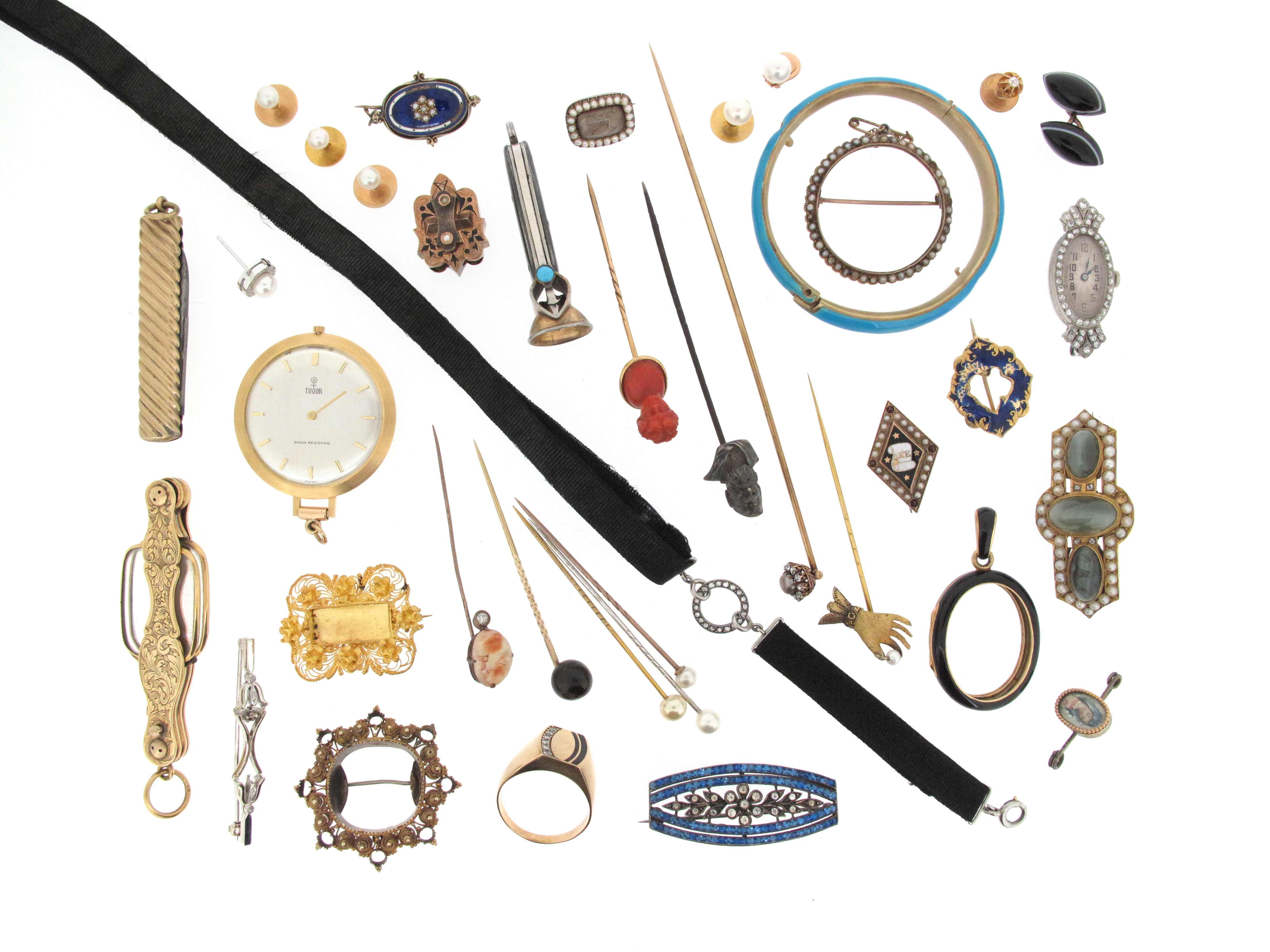 Various items of jewellery, including a diamond-set white gold wristwatch, eleven assorted brooches, a gold slide, a blue enamel bangle and a black enamel pendant frame, a gold ring set with diamonds and with black enamel bands, an open-faced gold dress pocket watch by Tudor, a dress pen knife, a cigar cutter, six assorted studs, eight stick pins, a cufflink and a hat pin