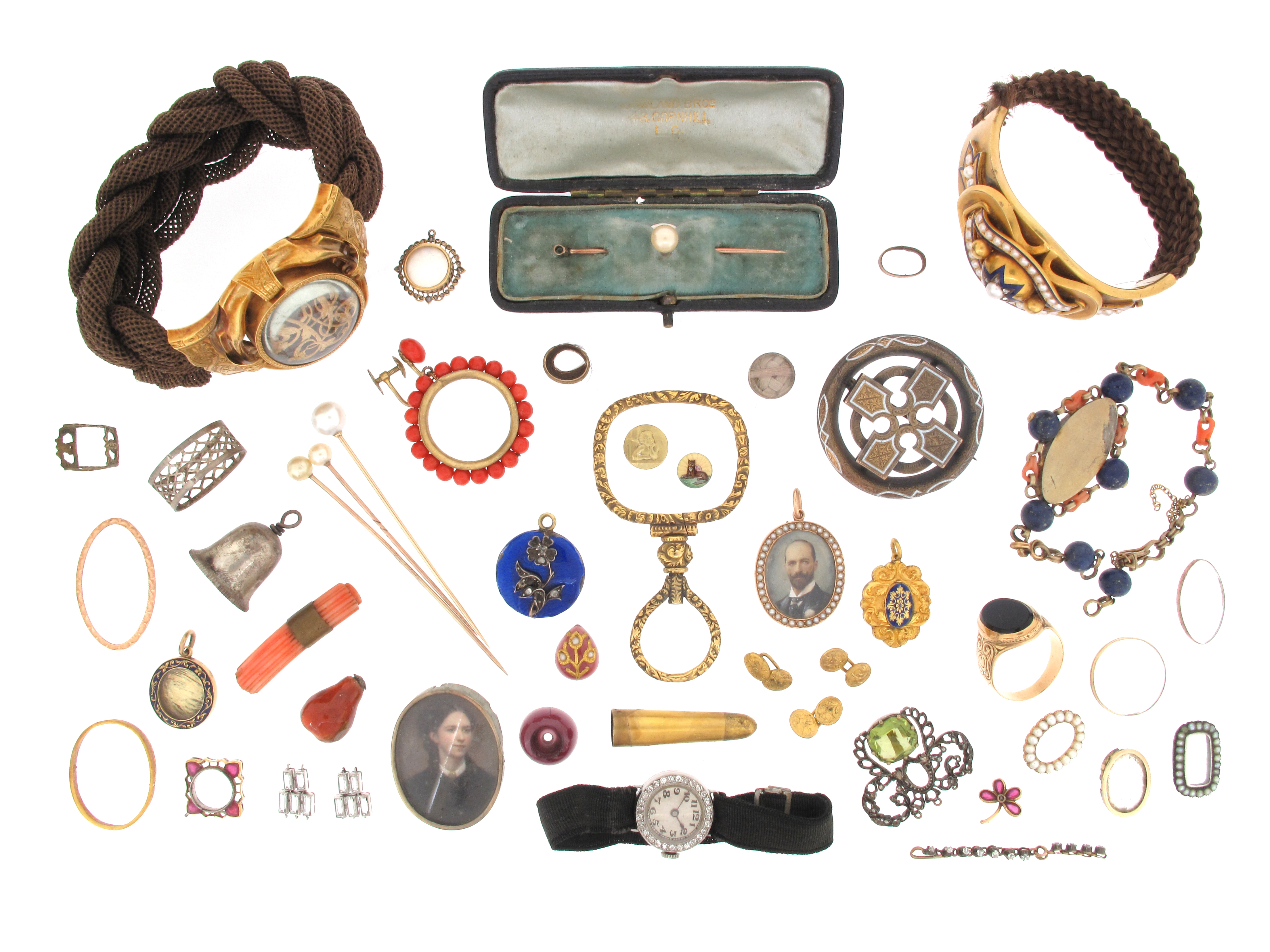 Various items of jewellery, including a 19th century plaited hair bracelet with gold clasp applied with gold initials, a 19th century plaited hair bracelet with pearl-set gold clasp centred with a pearl and diamond star and blue enamel decoration (damaged), a diamond-set cocktail watch, a stone-set gold signet ring, six assorted pendants, a Regency gold quizzing glass frame, and various other items of jewellery
