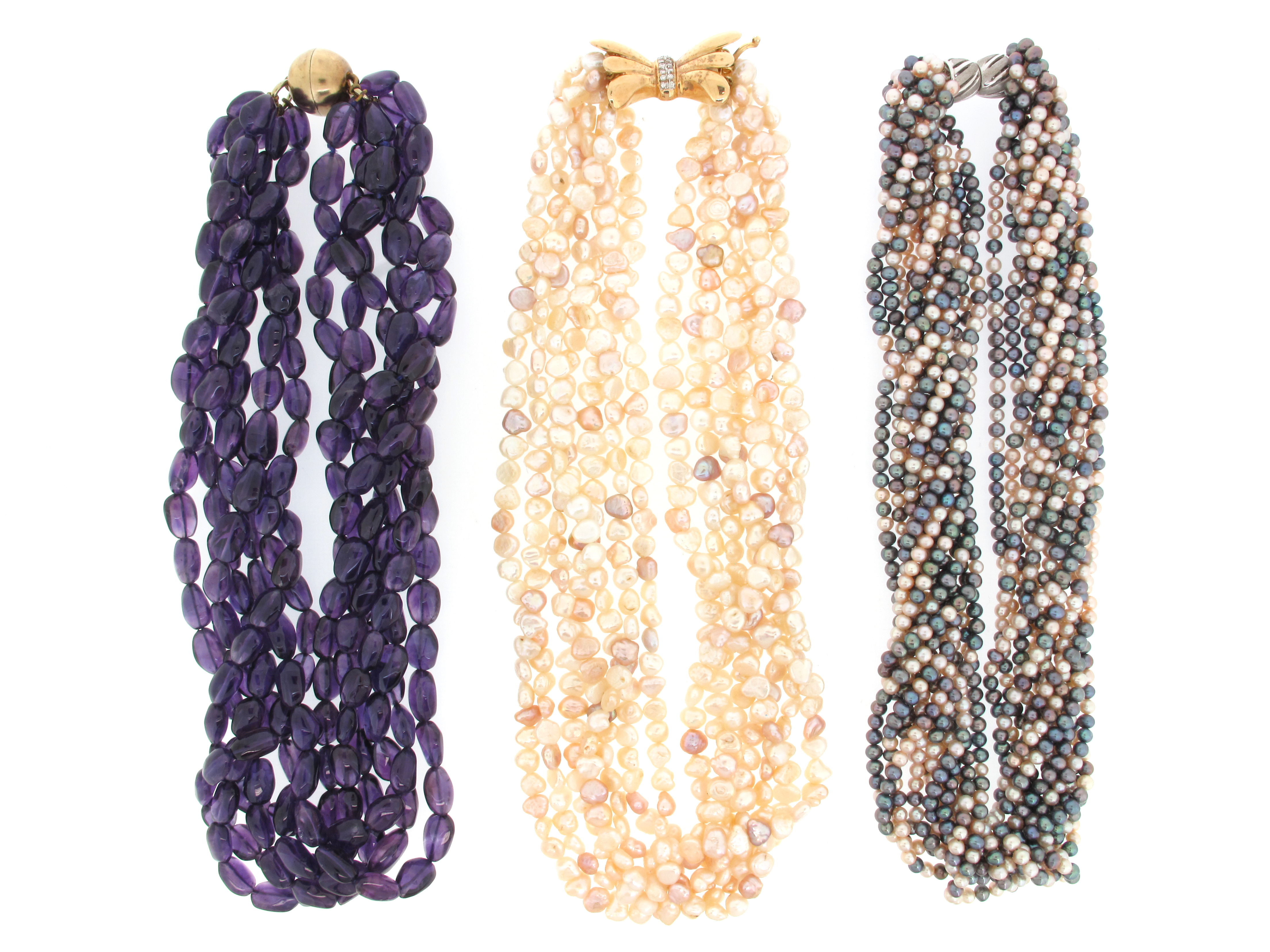 A six-row amethyst cabochon bead necklace with magnetic clasp, a seven-row cultured pearl necklace, a diamond-set gold bow clasp and a twelve-row grey and white cultured pearl necklace
