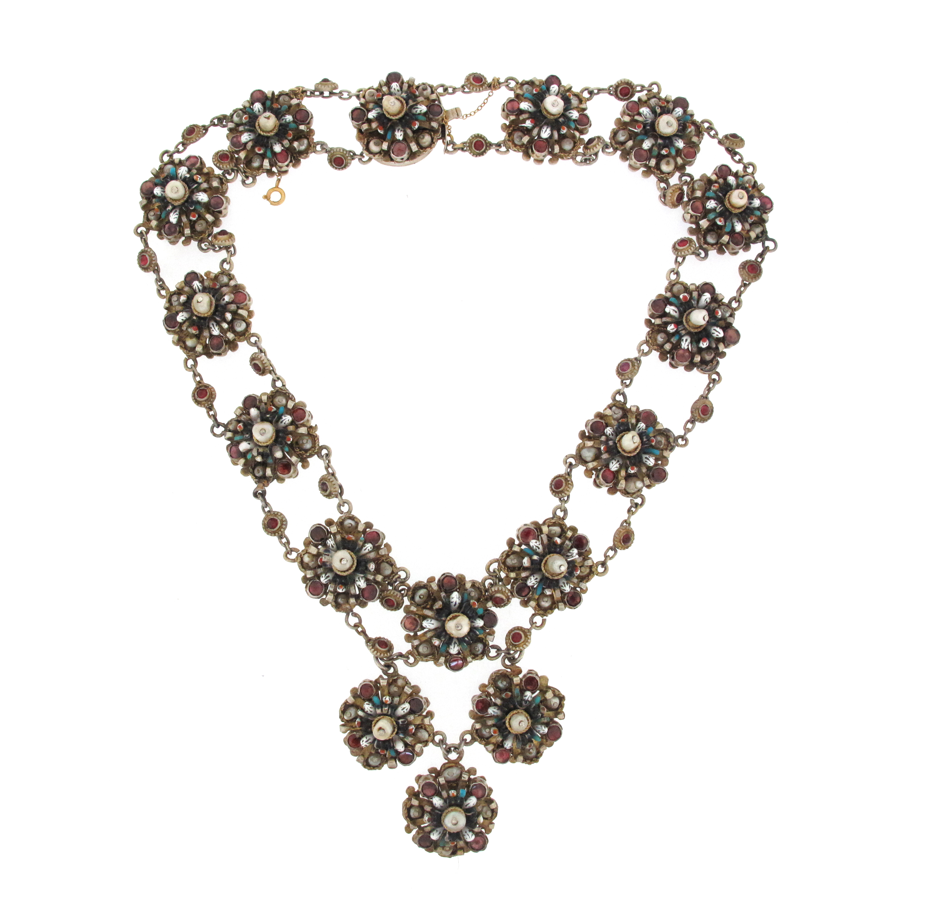 A Renaissance Revival necklace, formed as gilt metal clusters mounted with garnets and pearls with enamel decoration to both sides, 45cm, fitted case