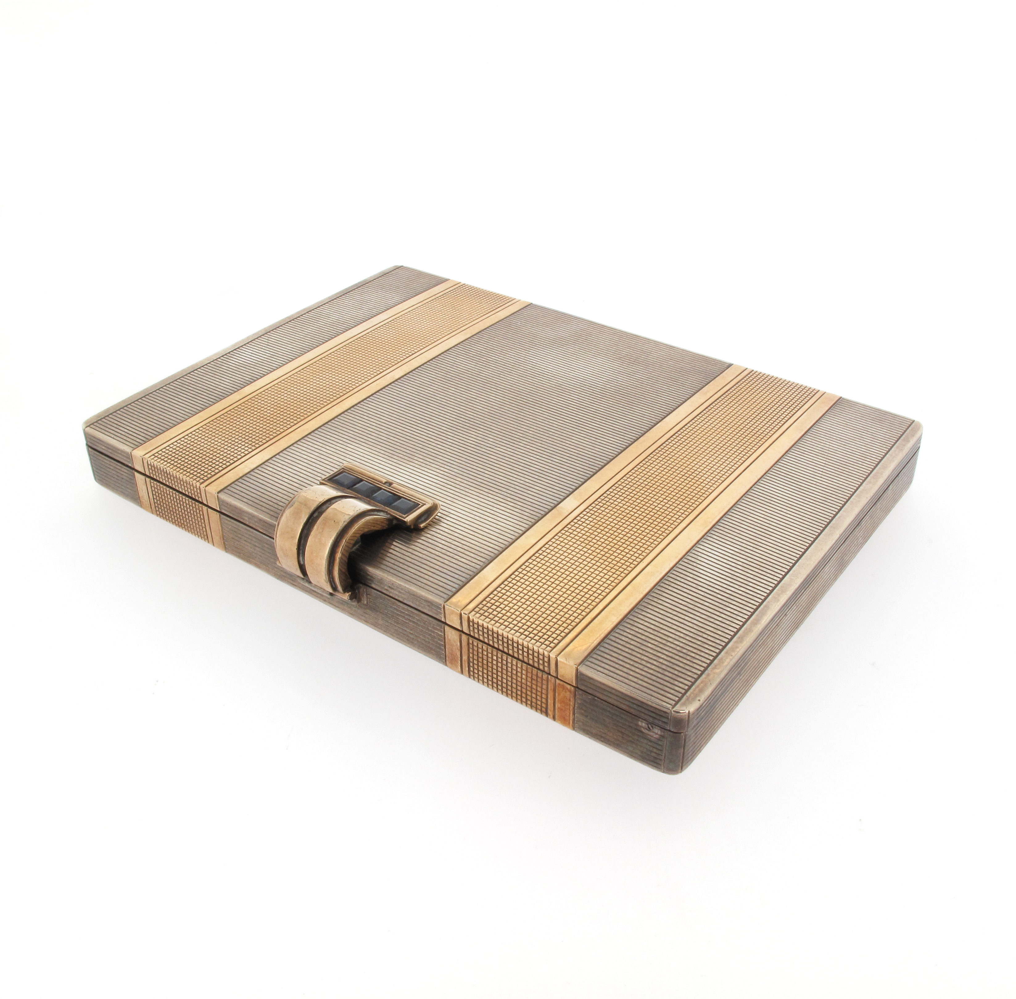 A gilt lined silver rectangular minaudiere, 1930s, striated rectangular form with two gold bands with engine-turned hob-nail centres within plain polished borders, the hinged cover opening to reveal various compartments, including a hinge-covered vanity engraved with initial G, the clasp set with four square-shapes sapphires, 14.5cm wide, 457g total
