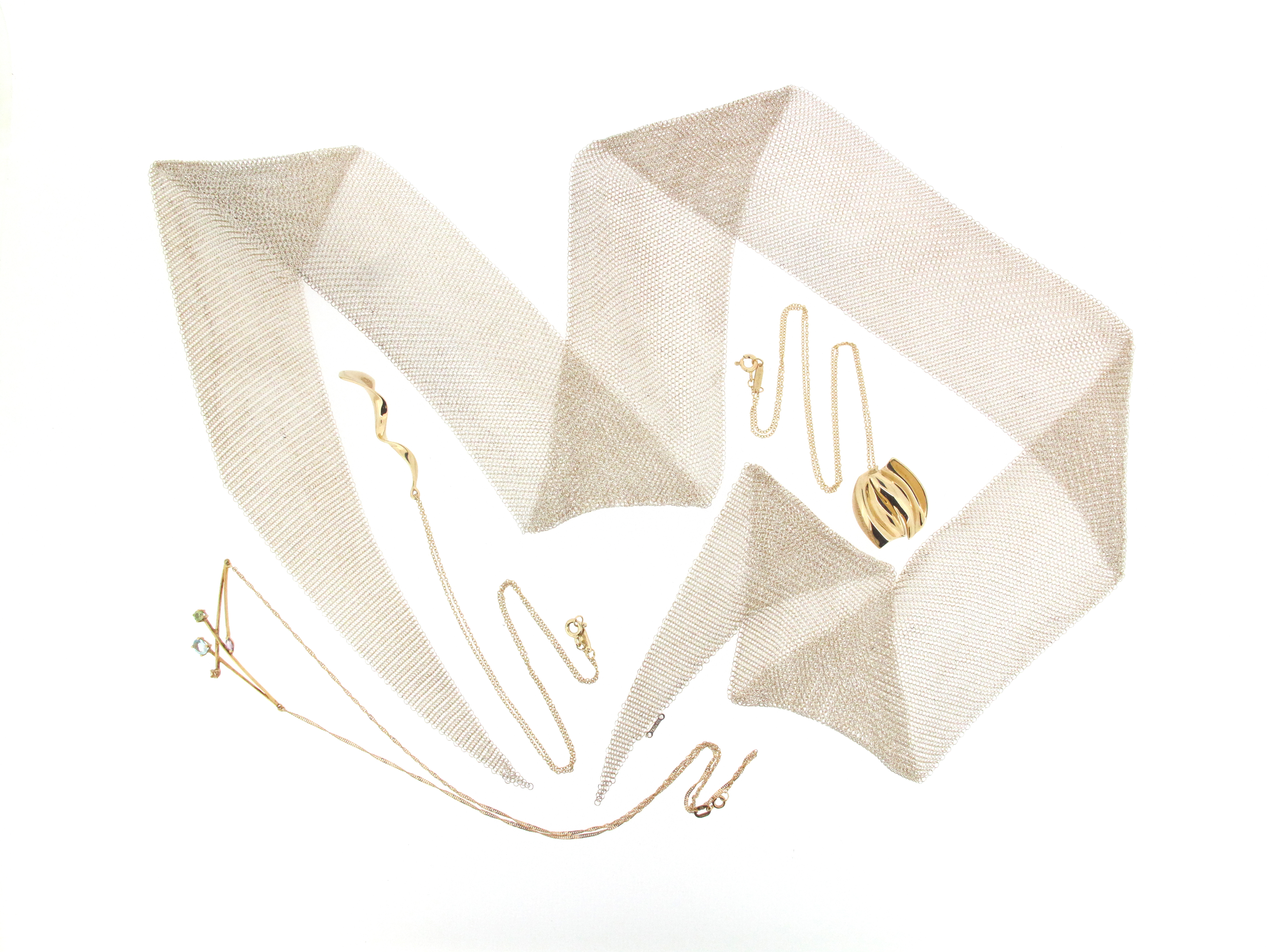 A fine mesh silver short scarf by Tiffany, signed T&Co, 90cm, a yellow gold abstract pendant by Tiffany on a fine-link yellow gold neck chain and a yellow gold swirl abstract pendant by Tiffany on a fine-link yellow gold chain, and a stone-set abstract yellow gold pendant set with four stones