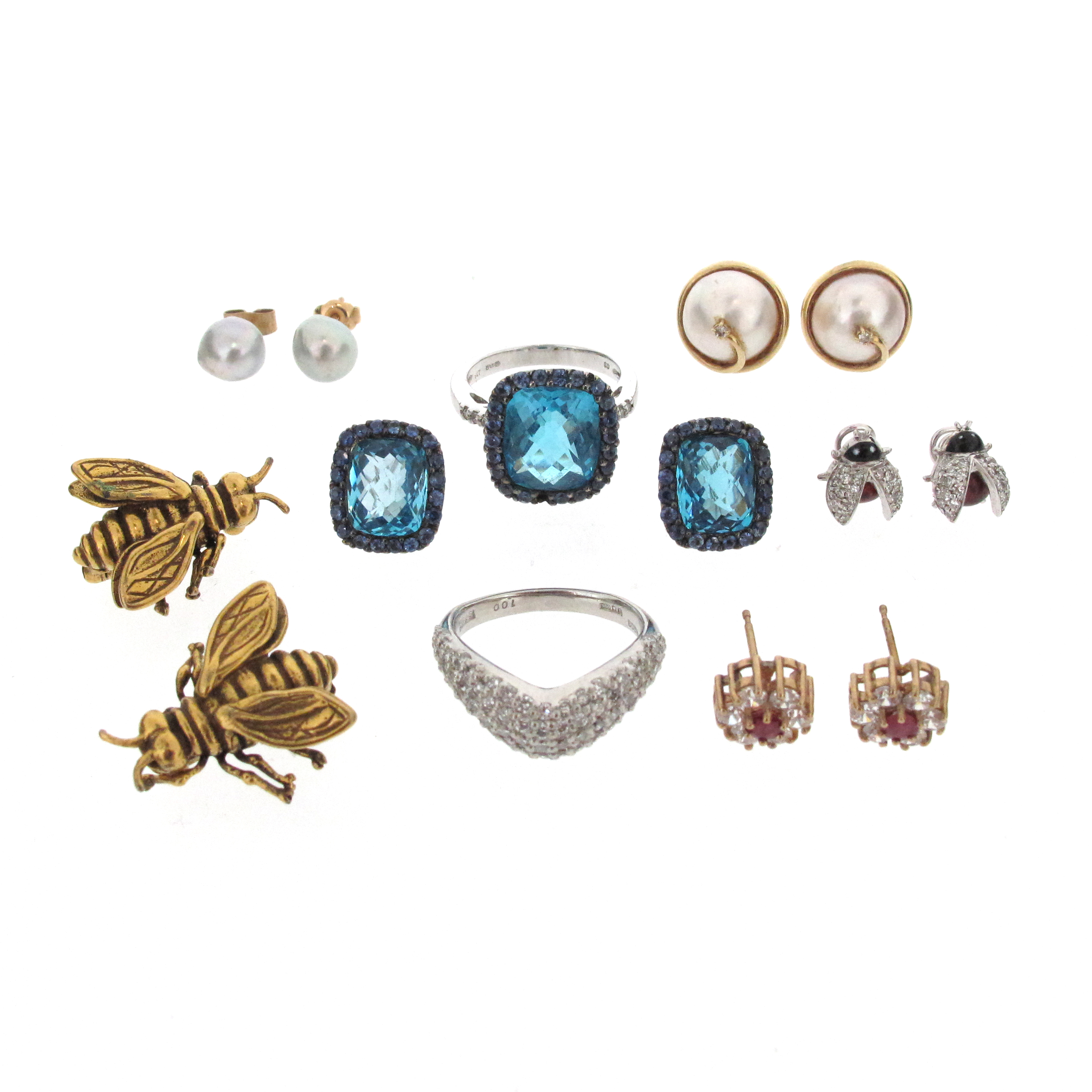 A small collection of jewellery, including a cushion-shaped blue topaz-mounted 9ct white gold ring, set within a surround of circular-cut sapphires and small diamonds to the shoulders and a pair of matching topaz and sapphire-mounted white gold earrings, a pair of diamond-set white gold bee brooches with diamond-set wings and enamel body and head with screw action attachments, a platinum ring pavé-set with small circular-cut diamonds, size K, a pair of mabé pearl-mounted gold earrings, each swirl set with a small diamond, a pair of gilt metal bee brooches, a pair of cultured pearl stud earrings and a pair of red and white-stone cluster earrings