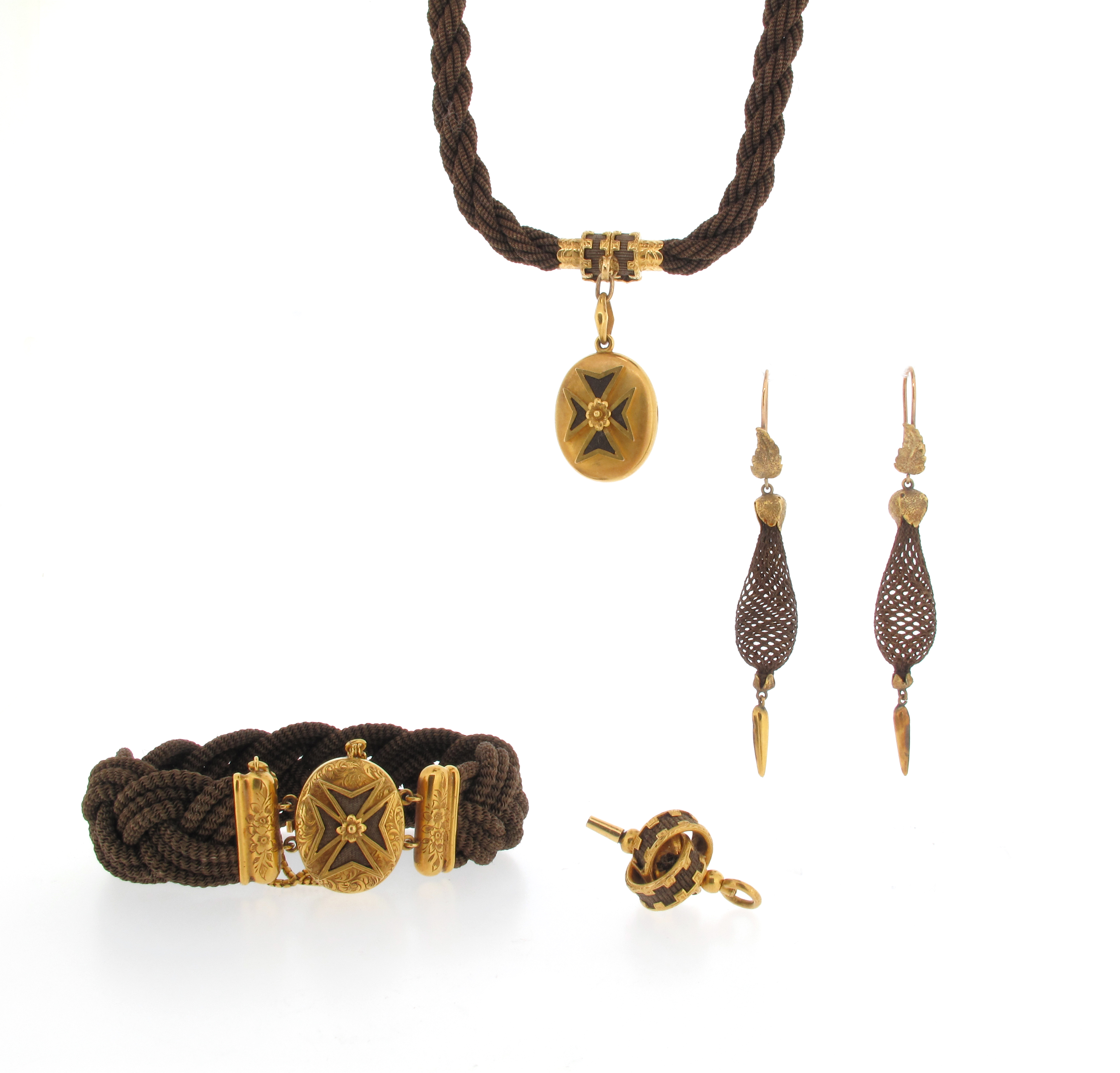 A suite of 19th century hair jewellery, c1880, the bracelet formed with plaited hair with an oval-shaped and engraved gold centrepiece, mounted with a Maltese cross design applied with hair, a pair of finely plaited hair drop earrings with gold leaf-form mounts, 8cm high, a plaited hair watch chain with gold mounts and with an oval gold locket mounted with a cross to each side with sections of plaited hair, 40cm, and a gold watch key formed with a knot design mounted with plaited hair