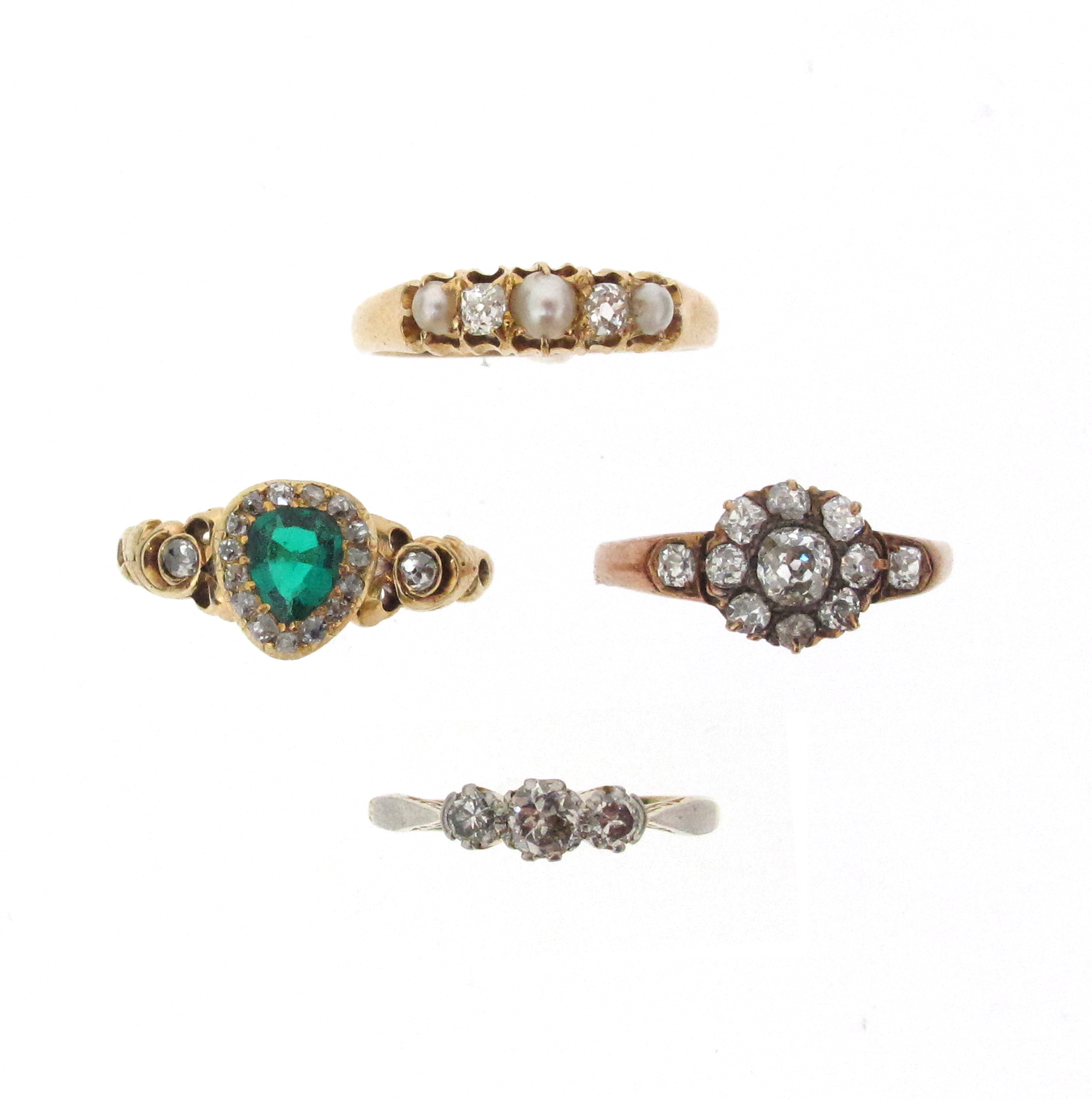 Four gem-set rings, including a Victorian pear-shaped emerald and diamond-set gold ring with pierced scroll shoulders, size N, a diamond-set gold cluster ring, size M 1/2, a gold half hoop ring set with three pearls and two diamonds, size O, and a diamond three-stone gold ring, size L 1/2