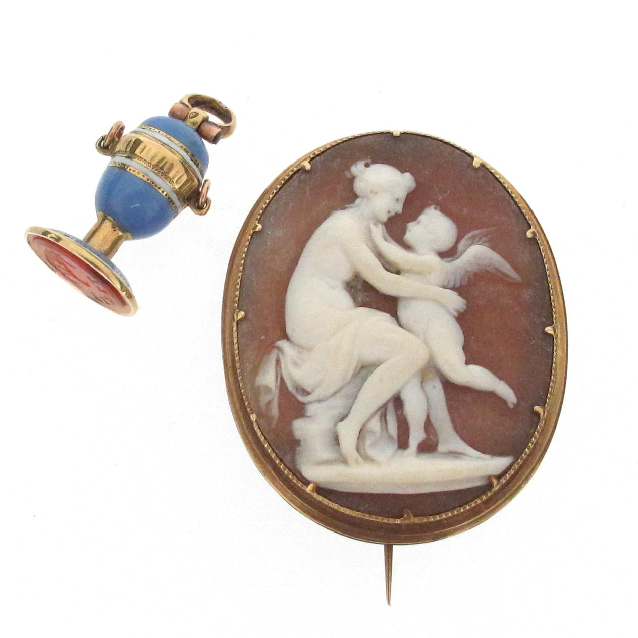 An amphora design miniature fob seal, decorated with blue and white enamel on gold and mounted with an agate intaglio engraved with a dog beneath the word 'fidel', 2cm high, and a carved shell cameo-mounted brooch, depicting Cupid embracing a seated psyche, gold frame and with plaited hair to the glazed reverse locket, 3.5cm high