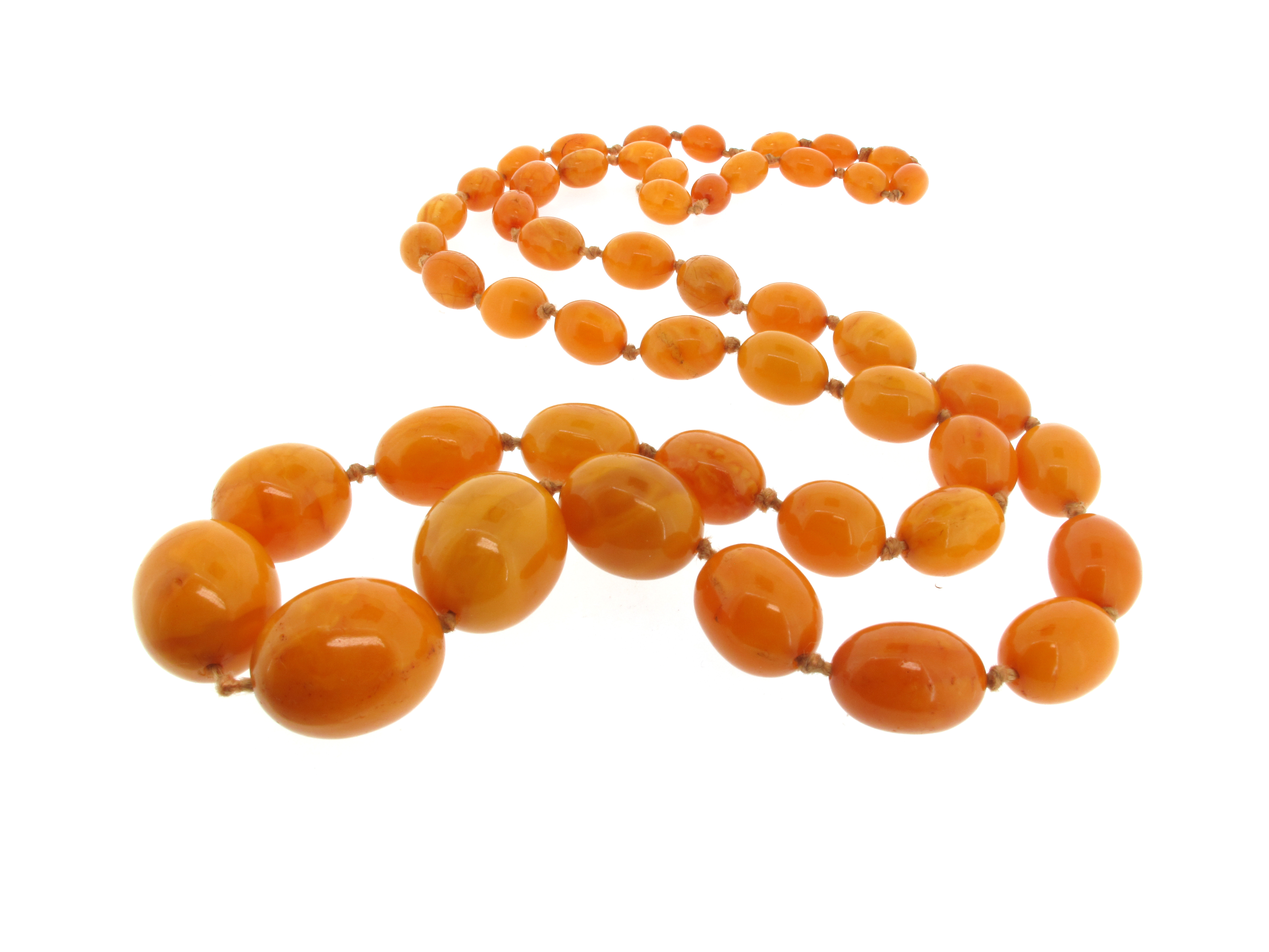 A graduated amber bead necklace, the forty-nine beads graduate from 10.6-21mm, 135g