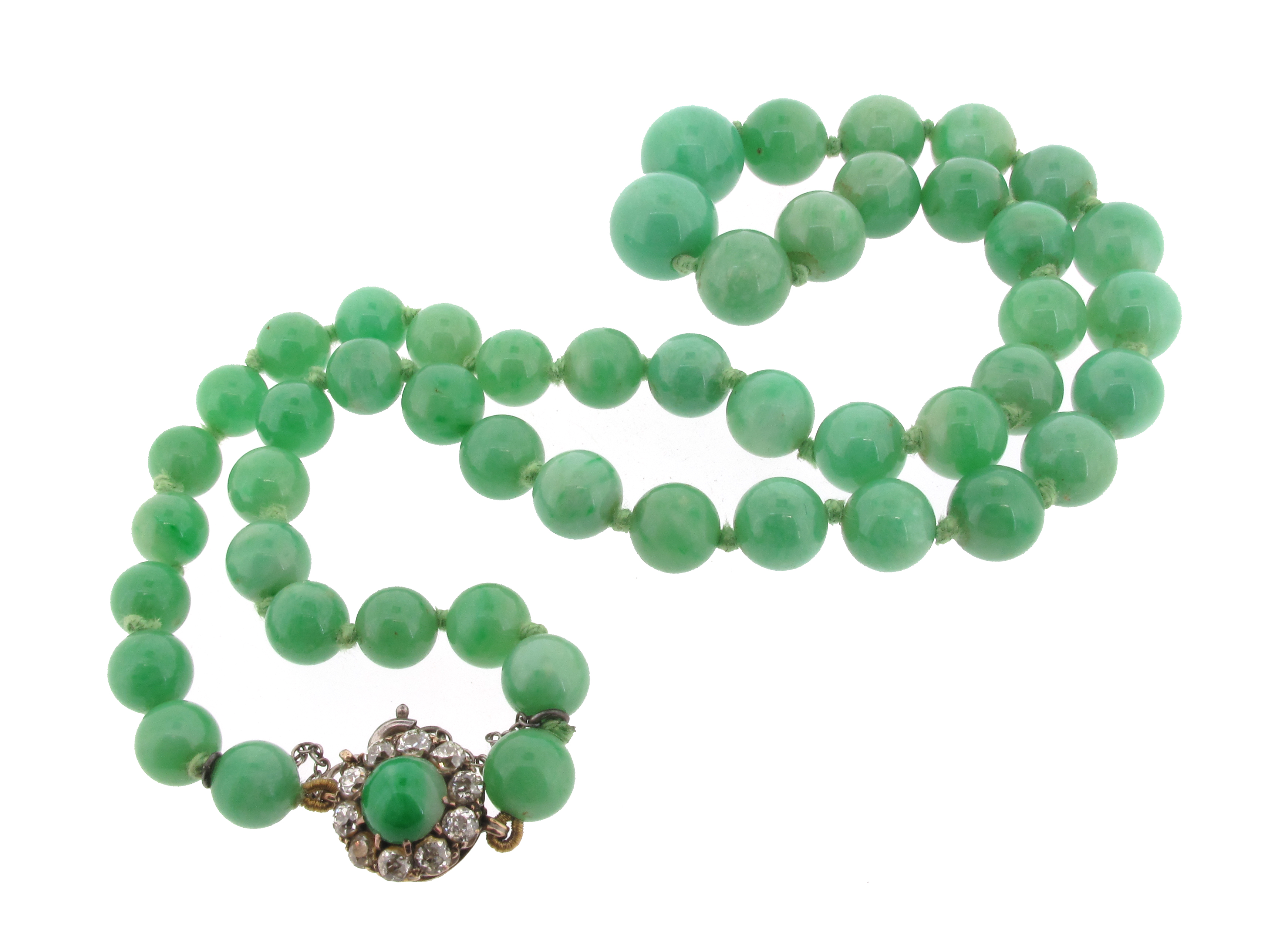 A single-row jade bead necklace, the graduated green jade beads measure 7 - 11mm and are set with a jade bead and diamond cluster clasp, 47cm long