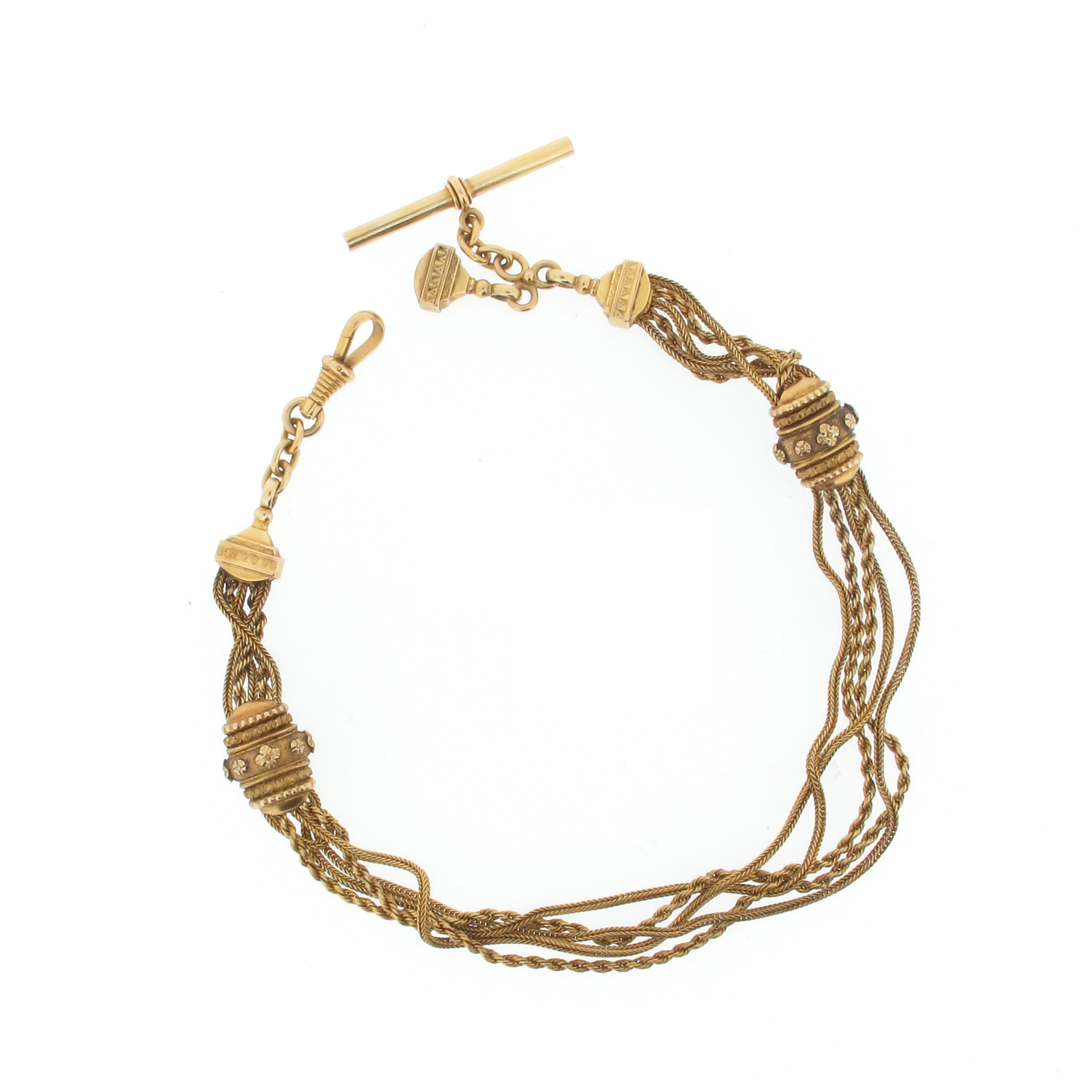 A late 19th century gold Albertina, comprising two twisted rope design chains and three fancy box-link chains, with two decorative slides, with swivel clip and t-bar, 31cm, 28g