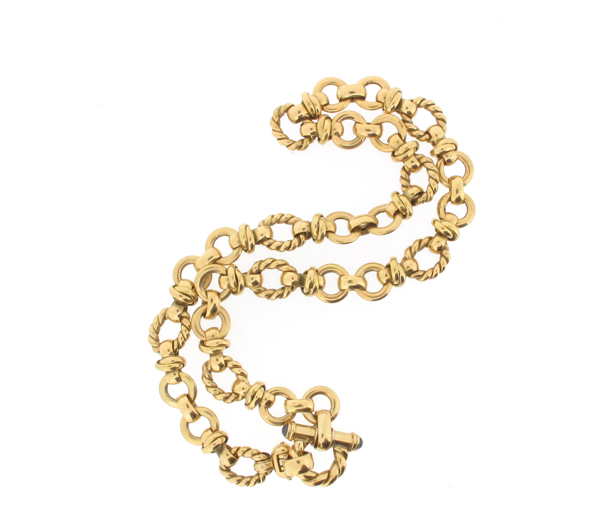 A yellow gold fancy-link necklace, designed as two smooth links separated with an oval-shaped twisted rope link, the clasp with cabochon blue stones to the t-bar terminals, 46cm, 44g