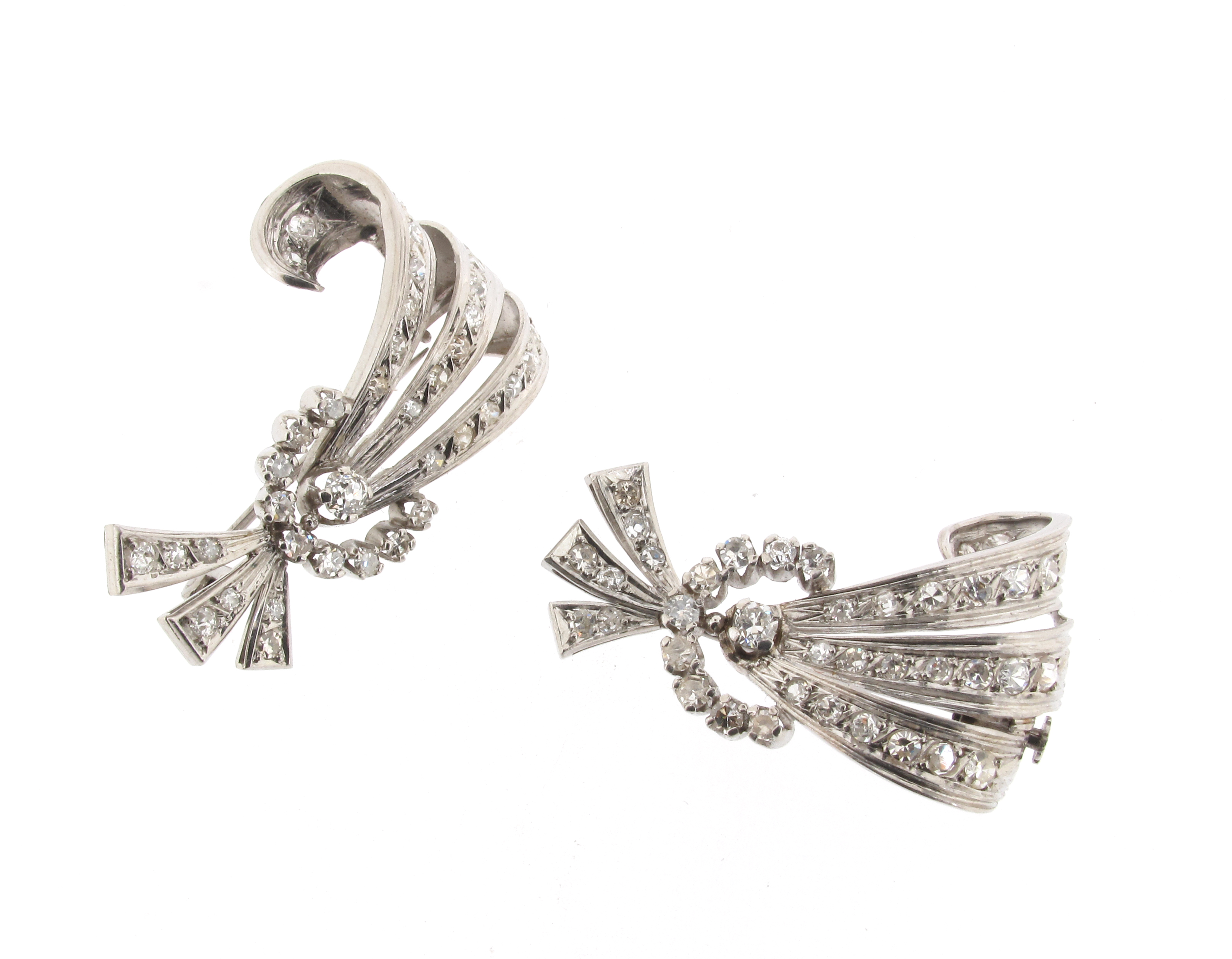 A pair of matching diamond-set scroll brooches, each scrolling spray brooch set with an old-cut circular-shaped diamond and further graduated single-cut diamonds in white gold, 3.5cm wide