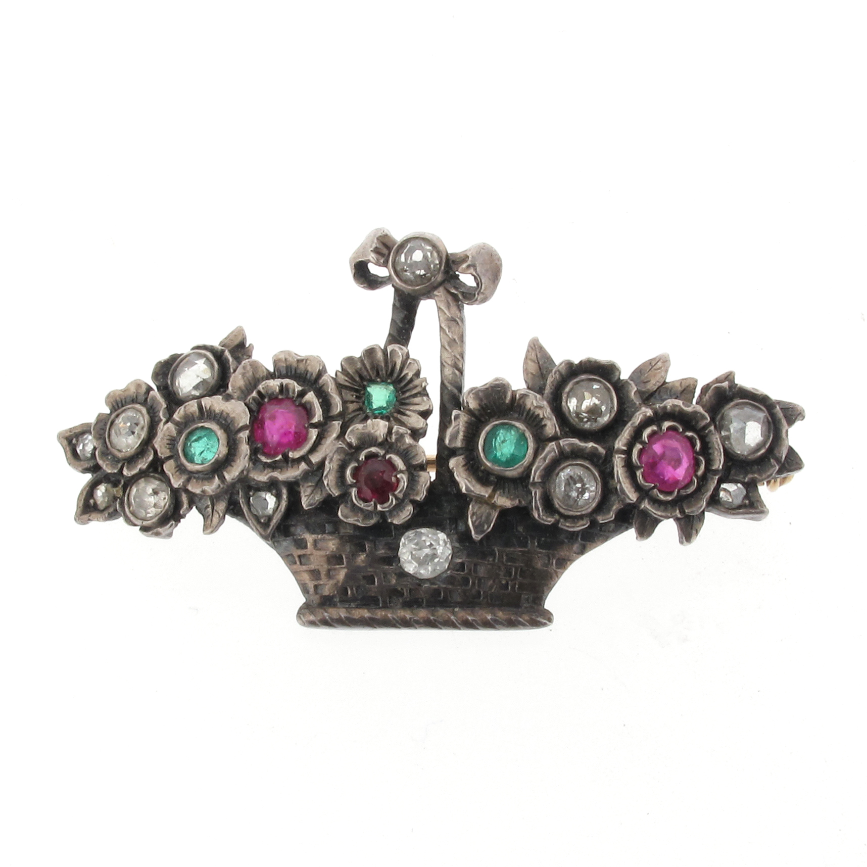 A gem-set giardinetto brooch, the flowers set with circular-cut emeralds, rubies and diamonds in silver and gold, 4.5cm wide