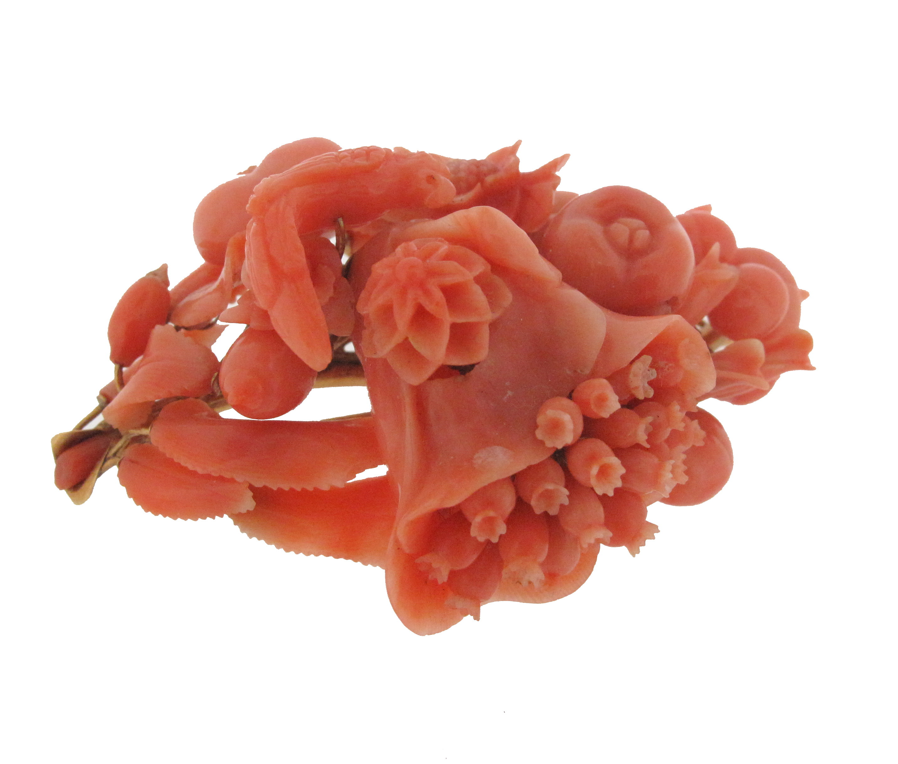 A 19th century carved coral brooch, of foliate form and with a parrot, gold mounts, 6.5cm high