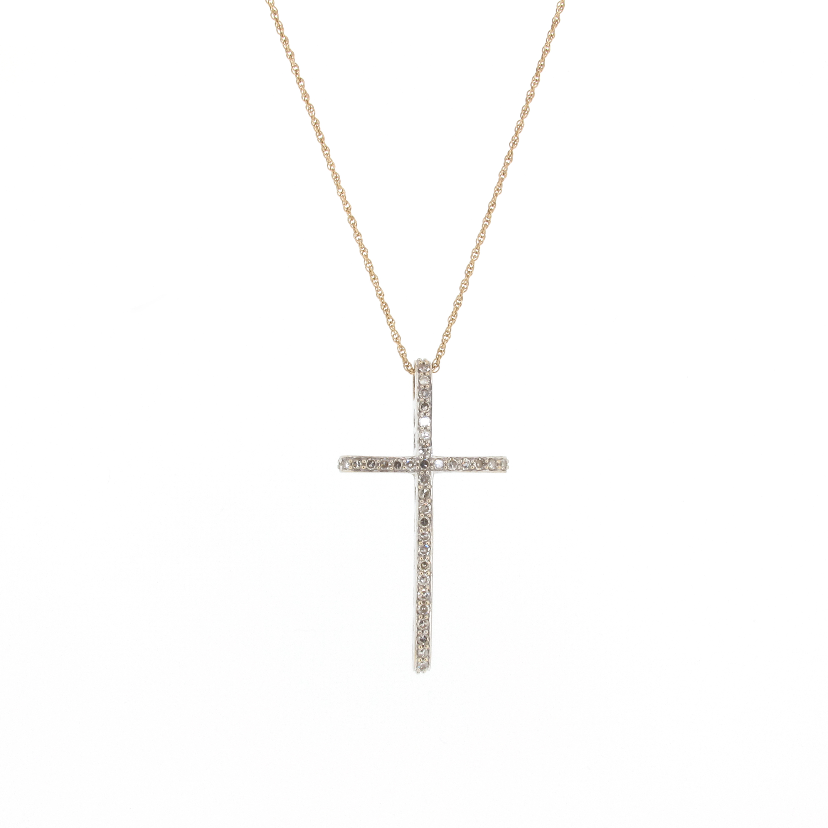 A diamond-set white gold cruciform pendant, on a fine-link yellow gold neck chain, the cross 3.5cm high