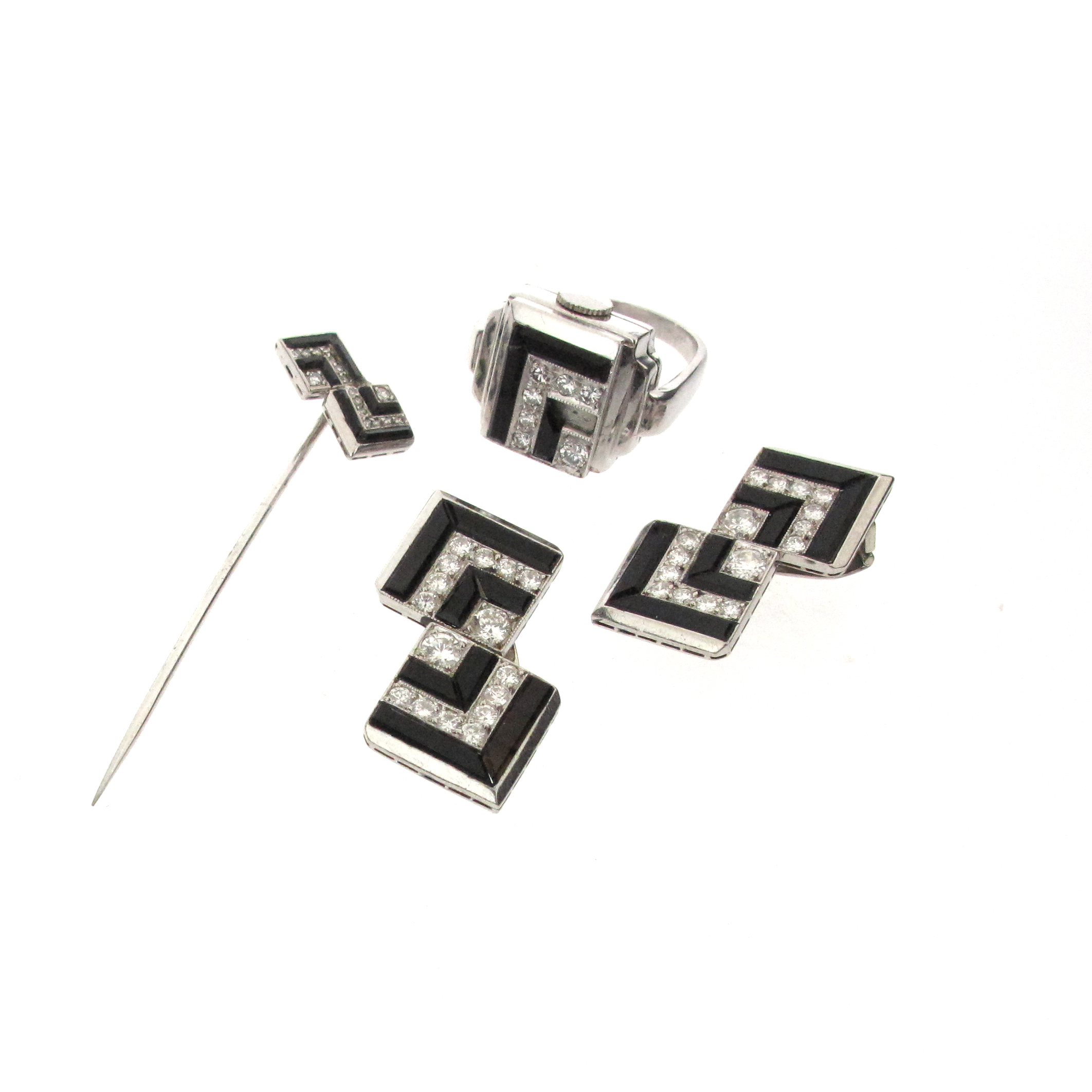 An Art Deco white gold watch ring, the black dial with gold numerals and signed Marvin, the hinged cover mounted with circular-cut diamonds and L-shaped sections of black onyx (one section missing), with a pair of conforming diamond and onyx set white gold earrings and matching stick pin, the watching ring size J